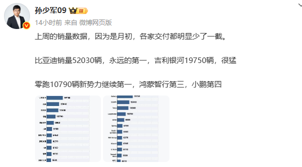 孙少军:上周的销量出来了,因为是月初,大家都比较少,比亚迪52,000多辆!