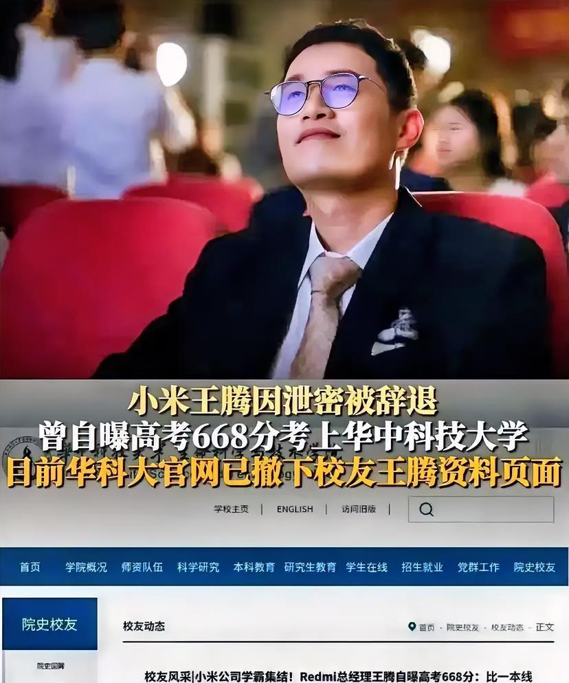 顶级阳谋! 王腾曾是高考668分考入华中科技的学霸, 在小米也是风光无限,可如今被辞退后,母校都不“认”他了,直接网站撤宣传。 不得不说学校效率高,不是优秀校友,就摆明立场,这才是给后面的学子树榜样,宣传正能量。 现在回看,王腾入学后可谓一路绿灯,毕业既入大厂,一年升一级,顺的不能再顺了。 这次雷总放了王腾一马,学校的反应也算合理。