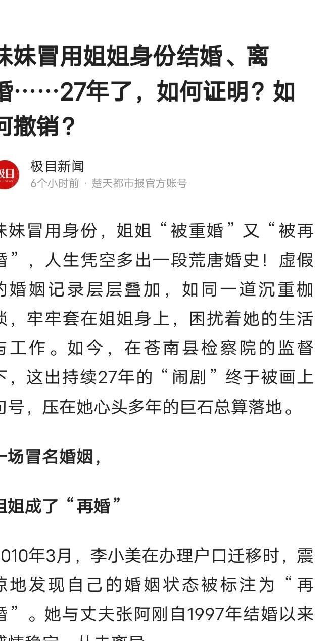据极目新闻报道,近日云南苍南县审理了一起再婚案,起诉人李小美成功的把自己的婚姻状态由再婚更正到已婚。 在婚姻状态更改完毕后,李小美表示压在自己心里的一块石头终于落下了。 事情还要从15年前3月的一天说起,这天李小美去办理户口迁移业务,哪知在婚姻状态栏,李小美发现自己的婚姻状态居然是再婚。 因为她当时和丈夫很恩爱,并不存在和丈夫离异的行为。 可工作人员却表示她的婚姻状态是合法标注的,不存在弄错的可能。 这让李小美非常吃惊,在和丈夫沟通的时候,李小美忽然想起了一桩旧事,在一九九八年的时候,她的妹妹李小丽曾偷拿自己的身份证和她的丈夫杨大勇领证结婚了。 因为当时李小丽并没有到达法定结婚年龄,但因为肚子已经大了,所以李小丽便偷拿姐姐的身份证登记结婚了。 果然,李小美把这件事告诉工作人员后,对方表示李小美的猜测是对的,有可能是因为李小丽的婚姻加在了李小美的婚姻上,所以才导致她的婚姻状态为再婚。 但是按照相关法律条文规定,李小丽在使用姐姐身份证登记结婚了,那李小美的婚姻状态应该是重婚状态,怎么突然就成了再婚呢? 于是李小美便找到李小丽,一番沟通后才知道问题出在了哪里。 原来在二零零八年的时候,李小丽的结婚证丢失了,因为当时非常需要结婚证,因此李小丽只能再办一张结婚证。 不过,在领结婚证的时候,李小丽先使用姐姐李小美的身份和杨大勇离婚,然后再用自己的身份证和杨大勇结婚。 但是这样的纠错行为却产生了荒诞的结果,李小美的婚姻状态变为再婚。 因为这样的婚姻状态在生活中有诸多麻烦,所以李小美把相关单位起诉了,要他们撤销自己再婚的婚姻状态。 那么从法律角度,该如何看待李小美所遭遇的这种事情呢? 根据《民法典》第一千零四十六条、第七条、第八条、第九条规定:结婚公民需要双方均具备自愿结婚原则,且双方均到达法定结婚年龄,才可以登记结婚,但需要从合法机关持有效身份证登记结婚,在登记完结婚后,双方便确定了婚姻关系,可以享受相关的权益和承担相应的法律责任。 本案中,李小丽、李小美的结婚行为都属于双方自愿原则,且姐姐李小美的登记结婚的行为符合相关法律规定,既到了法定结婚年龄,又使用的是自己的身份证,因此她的婚姻状态是合理合法的。 而妹妹李小丽在登记结婚的时候,因为年龄并没有到法定结婚年龄,加上她使用的又不是自己的身份证,因此她的婚姻状态以及她所带来的姐姐的婚姻状态都是不合法的,应该予以撤销。 根据《民法典》第一千零四十六条、第七条、第八条、第九条规定:禁止公民出现重婚和未到法律年龄结婚的行为,这类婚姻不受法律保护。 重婚罪是指已有配偶的情况下,还与其他异性登记结婚的行为。 本案中,李小美已经和丈夫结婚了,但是隔了一年后,李小美的妹妹又使用了她的身份证再次登记结婚,虽然李小美并未发生事实重婚,但已构成了法律重婚的要件,因此相关机构才会认定李小美已经重婚和再婚了。 那么重婚罪将受到怎样的量刑和法律惩处呢? 根据《民法典》相关条例,犯有重婚罪的公民,在出现法律重婚认定或事实重婚认定的其中一种,都要追究相关行为人的法律责任,但是如果出现一些意外情况导致重婚的,可以免于法律的责任追究,但真正的重婚罪行为人,将面临两年以下有期徒刑或拘役。 本案中,李小美的事就是法律重婚的界定,因为她并没有发生过和其他男人重婚的事实,因此她便不构成事实重婚。 但是其使用了身份证与其他男人登记结婚,因此被界定为法律重婚,考虑到李小美并没有重婚意图,且犯下重婚罪的动机也是出于意外导致,因此李小美可以不追究相关责任,但仍需纠正自己的法律错误。 对于此事,您怎么看?