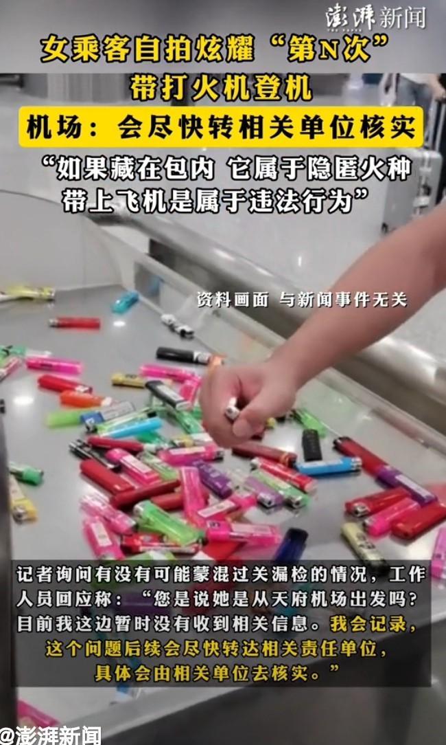 这也太嚣张了!女子在乘坐飞机的时候,居然靠着自己的小聪明把打火机带上了飞机,甚至还在乘坐飞机的时候拍照炫耀。相关部门表示,偷带打火机上飞机,属于违法行为,他们会尽快转相关单位核实。 据极目新闻报道,近日,天府机场的一则视频冲上了热搜,在该视频里,可以清晰分辨出视频的地点是在飞机舱里,而视频的内容则是一名女子举着一部有着明火燃烧的打火机。 这名女子表示,这是她第N次带打火机上飞机,这是怎么回事呢? 近日,夏女士在天府机场订购了一张飞往其他城市的机票,值得一提的是,夏女士平时就有着吸烟的行为,在等候飞机的时候,夏女士烟瘾突然犯了,想着坐飞机去目的地要好几个小时,夏女士便觉得有些郁闷。 于是在过安检的时候,夏女士想起了之前几次的违法行为,于是在趁安检员不注意的时候,偷偷将打火机藏在了自己的一款可以隐蔽打火机的包包里。 在通过安检的时候,因为前边的一些旅客发生矛盾,导致在检查夏女士的时候,机场的安检员并没有发现夏女士藏在包里的打火机,于是夏女士便带着打火机上了飞机。 夏女士是一个非常叛逆的女人,在乘坐飞机的时候,她所坐的座位是靠舷窗一带,可能是为了炫耀自己的“高明”,夏女士对其旁边的旅客表示自己有违禁品打火机。 因为这名旅客不相信夏女士能有这般手段,于是在飞机即将起飞的时候,夏女士便将包里的打火机拿了出来,然后打开了火闸,从夏女士拍摄的视频可以清晰的看到机场外的各种机场设施。 当然我们知道机场的安保措施是非常严格的,像什么打火机之类的违禁品,是很难带上飞机的,因此不排除夏女士是用了P图软件才把打火机“带上了”飞机。 对此,有关部门表示,会尽快对接相关部门查出这则视频的背后真相,如果属实,将追究相关人员的刑事责任。 那么从法律角度,如何看待夏女士的这个行为呢? 根据《民用航空法》规定承运航空公司需遵守安全检查规定,对旅客或行李、货物实行严格检查,将影响飞机安全驾驶的不利因素排除在外。 在本案中,打火机属于航空危险物品,一旦打火机被歹人带上飞机,轻则造成人员伤亡,重则导致飞机出意外,因此夏女士的这番行为属于违法行为,如果属实的话,会被追究相关刑事责任的。 那么假如夏女士真的有带打火机上飞机的行为,那么该如何处置呢? 根据《治安管理处罚法》和《民航旅客禁止随身携带和托运物品目录》中规定:相关乘客在接受飞机服务的过程中,禁止携带打火机、火柴等物品,如果私自带有这些物品,将根据违法结果进行处罚,严重的会被刑拘。 根据相关法律条文,可知道一旦被发现私自带打火机上飞机 ,最高罚款会在5000元以下,并有可能遭受一定的刑拘。 如果夏女士带着打火机引发了安全事故,那夏女士极有可能会获刑。在相关法律中明文规定如果夏女士是靠夹带、隐匿方式把打火机带上飞机的,那么将会受到更重的处罚。 《刑法》第二百二十二条规定:个人或单位发布虚假视频,导致产生了严重的社会影响,比如引发民众恐慌等结果,会被认定为编造、故意传播虚假信息罪。 根据违法涉案资金进行量刑,如果出现行为特别恶劣的,则会被重罚。它的一般量刑标准为:个人参与犯罪的,一般会被处以三年以下有期徒刑或刑拘,并处罚金。在造成严重后果后,会被量刑为三年以上七年以下有期徒刑。 在本案中,夏女士的虚假信息传播是关于在飞机上带打火机乘坐的视频,这会定性为虚构事实扰乱社会秩序,如果引发了民众恐慌,那夏女士就麻烦了,那她至少是三年以内的刑罚。 对此,你怎么看?
