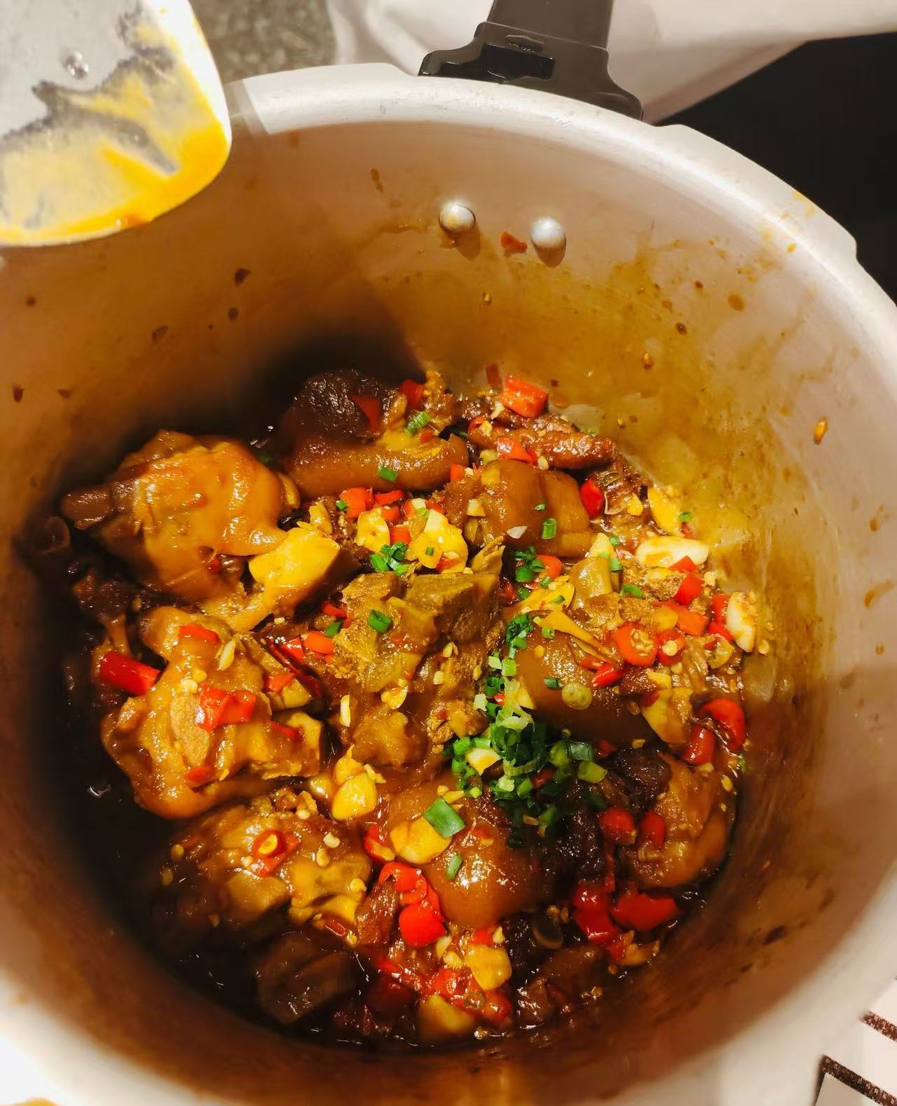 3️⃣.压锅猪脚,长沙剁辣椒,葱蒜,一起焖,猪脚炖得软烂好吃。