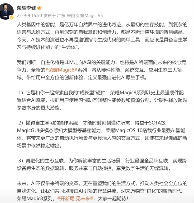 荣耀Magic8系列这次也有了iPhone17同款的直屏和直角边框,而且还搭载了一枚实体AI键,被李健称为“最强自进化AI原生手机”,能边用边升级,不止软件生态能进化,连硬件都能跟着用户习惯成长。听上去确实有点东西。