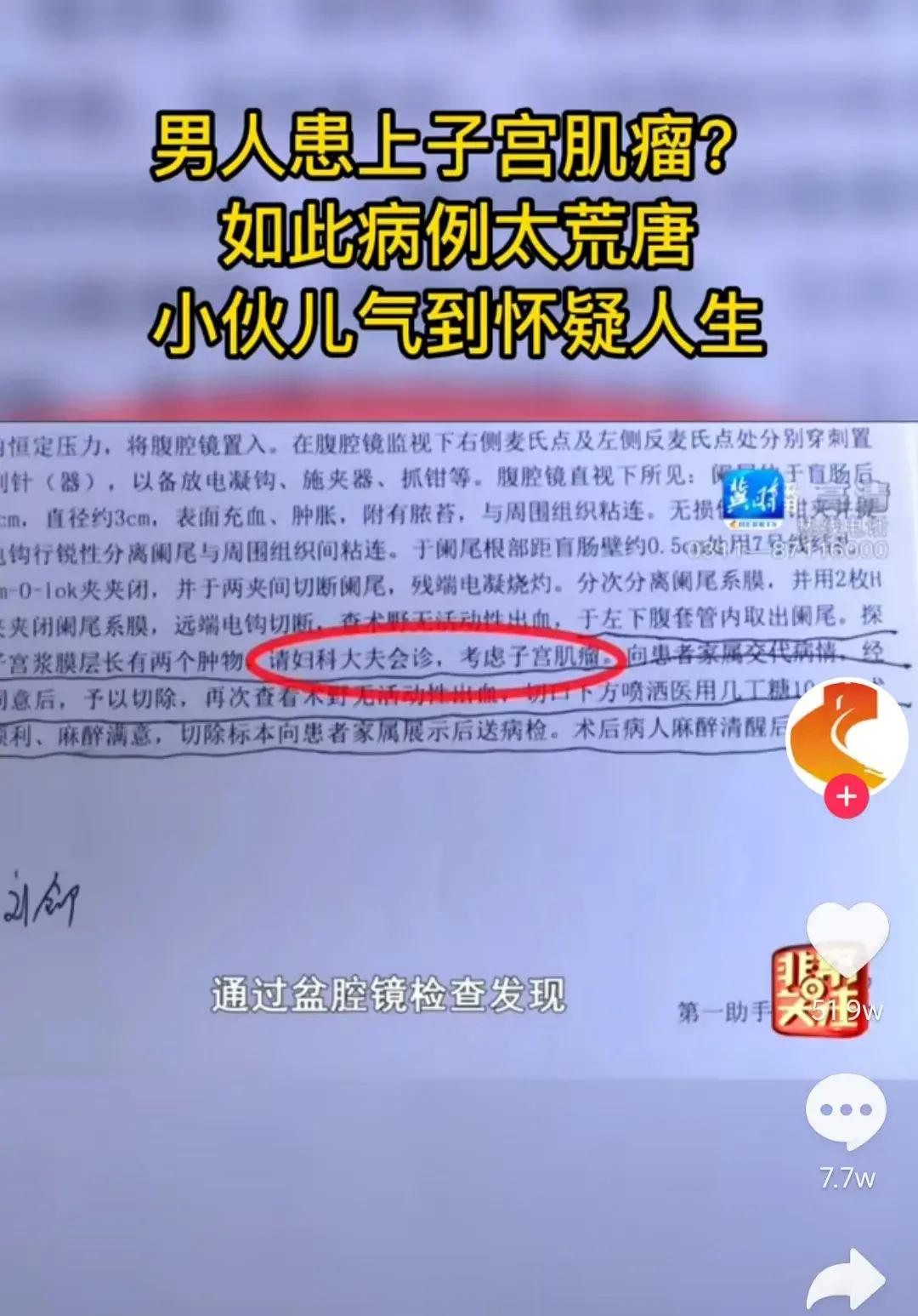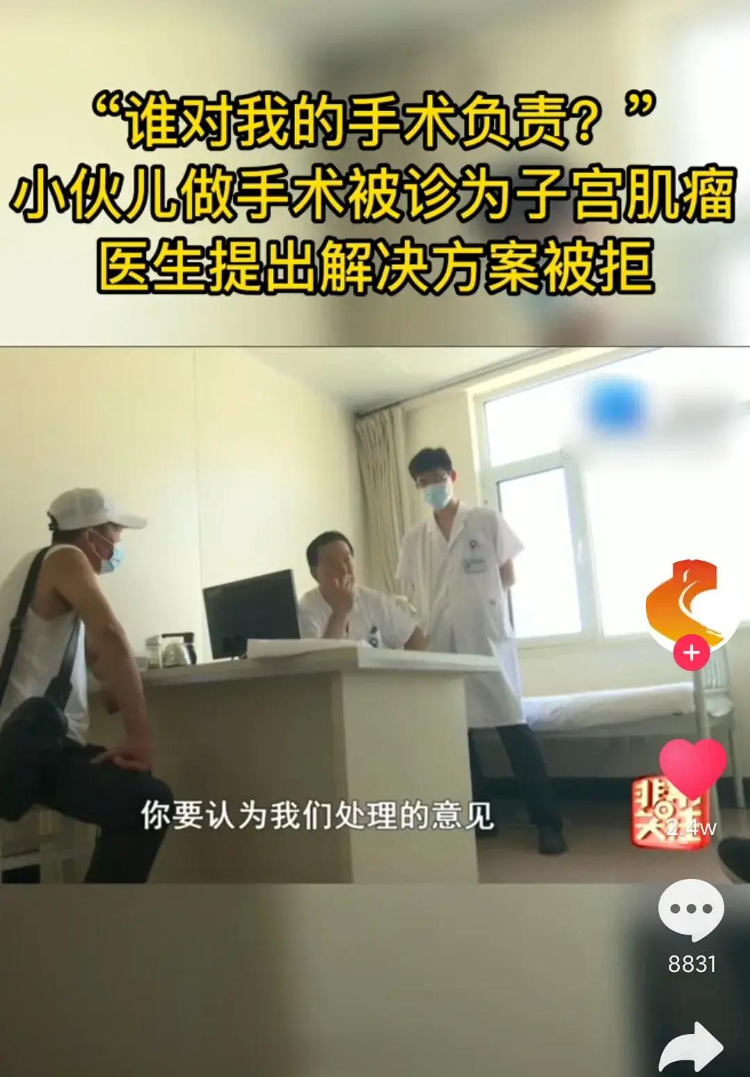 可是男子拿到之前的病历一看,彻底无语了。整个病历漏洞百出,本来是阑尾炎手术,被写成了胆囊切除手术,更让他不能容忍的是,上面还写着经过妇科大夫会诊,确诊他得了子宫肌瘤,需要切除。 男子气愤地表示,我是个男性,哪来的子宫,这是个基本常识啊!男子就此对医院的工作态度产生怀疑,觉得医院太不负责任,太马虎,才导致了他第一次手术不成功,还需要再次做手术。