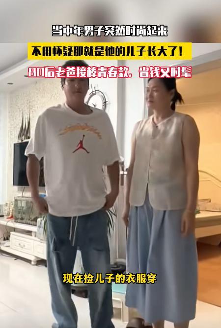 笑不活了!”江苏,妻子准备将儿子淘汰衣服扔掉,不料,却被丈夫拦下!说不要浪费,然后就把儿子的衣服穿上,主打青春派,原来,儿子17岁,身高是一米八,淘汰下来好多衣服裤子,包括鞋子,丈夫都可以穿。 那天,王女士正忙着收拾屋子,把屋里的每个角落都整理了一遍。阳光透过窗户洒进屋里,把灰尘微微映亮。 她弯腰翻看衣柜和储物箱时,突然注意到儿子很多衣服几乎都没穿过,标签还挂着,整齐地叠在一起。 王女士心里想着,这些衣服堆在家里既占地方,又没人穿着,留着也没有什么用处。 正当他准备把那衣服都扔掉的时候,孩子的父亲站了出来,他眼瞅着这些衣服也没什么毛病,于是就想着扔了也太可惜了,想着自己试试,能穿了就留下来。 别说,这位爸爸的身材和长到一米八的儿子还真差不多,那些衣服穿在他身上居然严丝合缝,效果出奇地好。 换上儿子行头的父亲,瞬间像是年轻了好几岁,一身“青春派”的造型,又潮又时髦,仿佛复刻了儿子的青春。 真正的笑点爆发在儿子放学回家那一刻。他一推开门,书包都来不及放下,就看到眼前这个熟悉的“陌生人”,当场就笑喷了。 他一边笑一边开玩笑,说老爸这是“偷穿”他的衣服,不过玩笑归玩笑,儿子真心觉得,这些衣服在父亲身上,比在自己身上还要好看。 妈妈看着丈夫穿上儿子的衣服,也忍不住笑了起来,说:好像瞬间年轻了十几岁,随后又说道:丈夫这辈子看来是注定要和旧衣服“锁死”了,小时候捡哥哥姐姐的,现在轮到捡儿子的。 当这件事被发布到网络上之后,引发了不少网友们的热议。 有人说:看着很合适啊,别说真是另一种风格。 还有人说:这下子可是真省钱了,现在年轻人买衣服更新换代快,他老爸要有穿不完的衣服了! 这种做法,绝不是什么“掉价”的行为,恰恰相反,这是一种聪明的过日子方式,一种不盲目追求消费,懂得善用身边资源的生活哲学。 信息来源:宿城融媒