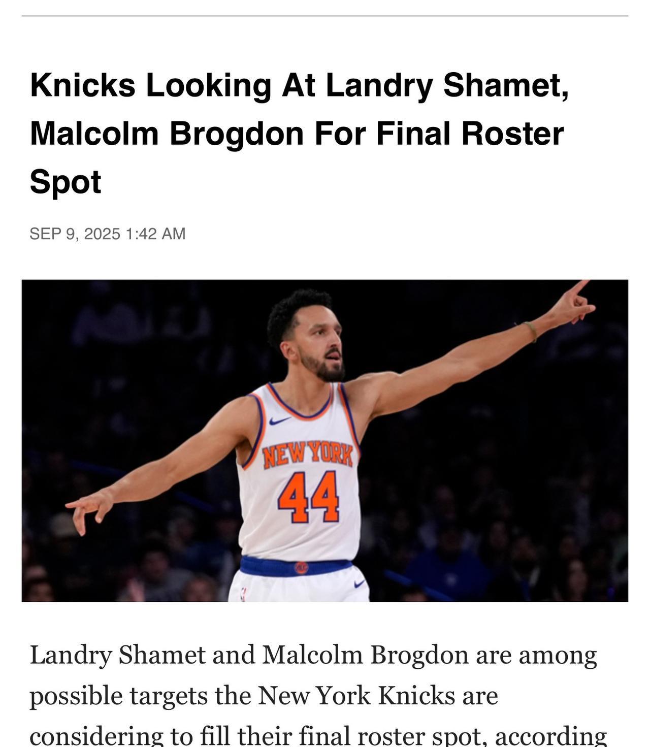 尼克斯在沙梅特和布罗格登之间二选一! 根据NBA记者Ian Begley报道:沙梅特和布罗格登 是尼克斯目前正在考虑填补他们后卫线上最终名单的可能目标。因为本西蒙斯此前拒绝了尼克斯提供的一年老将底薪合同。 目前尼克斯大名单上还剩下最后一个关键名额,尼克斯需要权衡布罗格登的伤病隐患和即战力的价值,同时也要面临其他球队比如勇士的竞价! 早在七月份的时候尼克斯就有意续约沙梅特,上赛季在尼克斯出战50场比赛,场均15.2分钟,可以得到5.7分,三分球命中率39.7,非常不错的射手。 虽然沙梅特的战术适配性更加适合,但是尼克斯目前后卫线上深度不足,如果布罗格登能够保持健康,能够为尼克斯第二阵容提供组织能力。 若布罗格登要价合理,尼克斯或许会以低成本风险优先考虑布罗格登!#尼克斯# #纽约尼克斯# #NBA# #NBA吐槽大会#