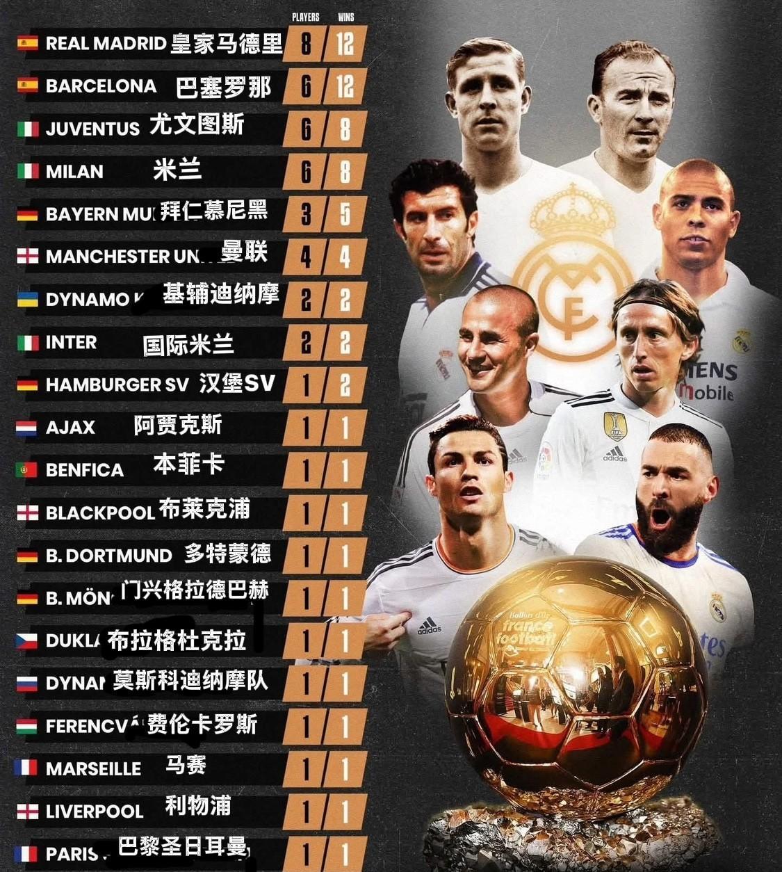 国际上拥有最多金球奖球员的俱乐部球队!!