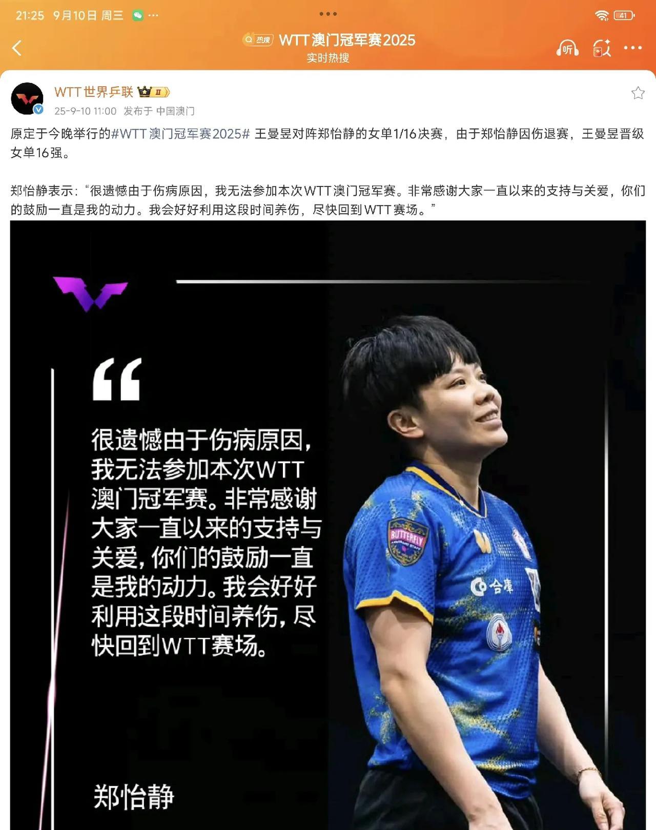 09月10日,王曼昱不战而胜,直接晋级16强,下一轮对阵早田希娜,这是一场硬仗,