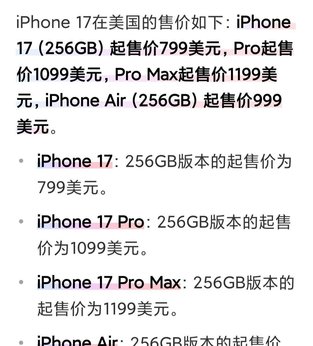 为啥苹果手机在中国和美国的售价不一样呢? 苹果公司9月10日发布了iPhone17系列价格 最便宜的是标准版256GB,国内售价5999元人民币,美国售价799美元。 最贵的是iPhone\u0005 17 Pro Max 2TB,国内售价17999元人民币,美国该系列起售价1199美元。 国内普通工薪阶层月工资4000元人民币左右。 国内普通消费人群买一部标准版iPhone17苹果手机,不吃不喝需要一个半月左右的工资。 美国普通工薪阶层月平均工资,基本上在3000-5000美元之间。 美国普通消费者购买一部标准版iPhone 17苹果手机,只需花费月工资的1/5左右。 苹果手机在中国境内组装生产,想拥有一部苹果手机,对国内消费者来说成了奢侈品,对美国消费者来说就是普通消费品。 大家说说看,为啥同一款手机,为什么价格相差这么大呢?