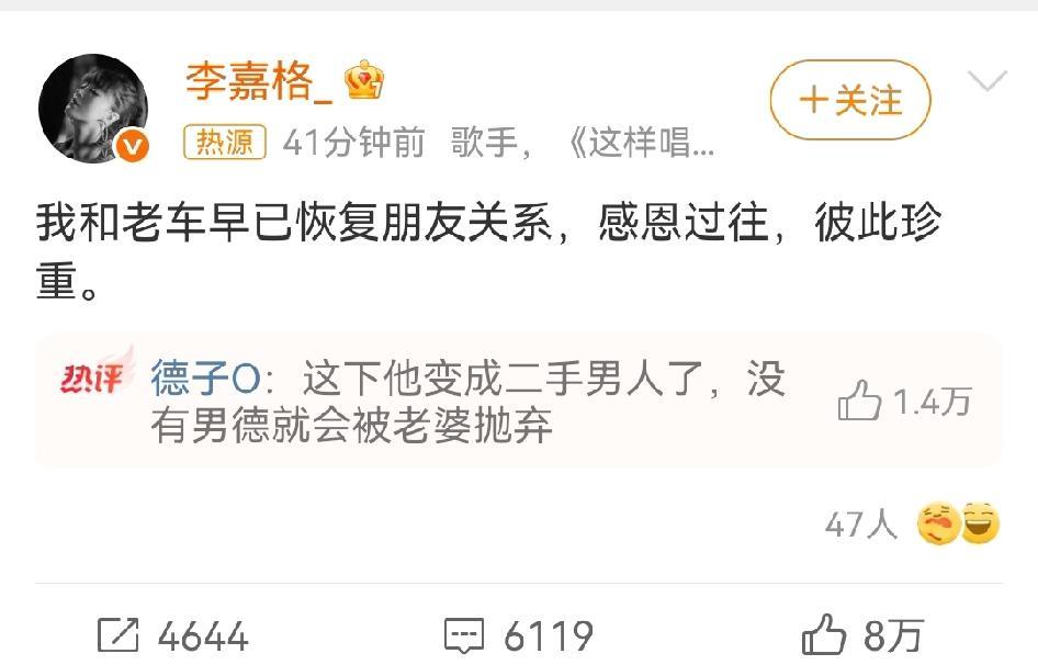 李嘉格太霸气了!车澈前脚被拍到和乃万搂搂抱抱,举止亲密,后脚李嘉格就发文说:“我和老车早就恢复朋友关系了,感恩过往,彼此珍重!” 网友们看到李嘉格的发言后,都怒赞她是大女人,太霸气了,还有人喊话那英多向李嘉格学一学,直接休夫。 而且小编觉得李嘉格说早就和车澈离婚了,应该是想给双方一个台阶下,毕竟她前几个月在综艺《是妈妈是女儿》里还说了她和车澈没离婚,之前很多次想离婚,但都为了孩子忍了下来。 但在这个节目播出后,很多网友觉得李嘉格不应该护着婆婆和老公,要多心疼心疼自己的亲妈,李嘉格也看到的这些评论,她现在自己也能赚钱养家,不需要依靠男人,所以就离婚了。 如今官宣离婚,也是看到车澈被曝出绯闻加随地大小便的丑闻,所以趁机把离婚的事儿说了,未来一个人独美。