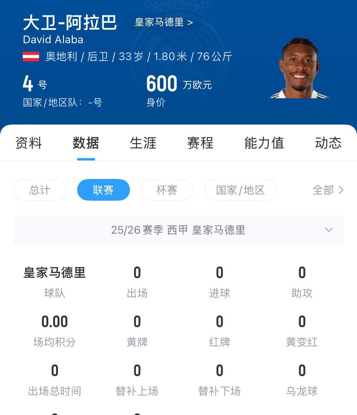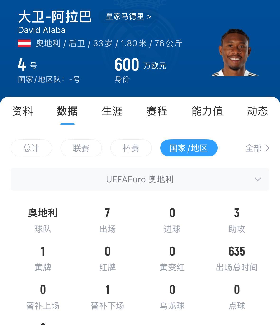皇马球星阿拉巴,皇马0出场,奥地利国家7次出场! 当然,阿拉巴自己也足够有职业素