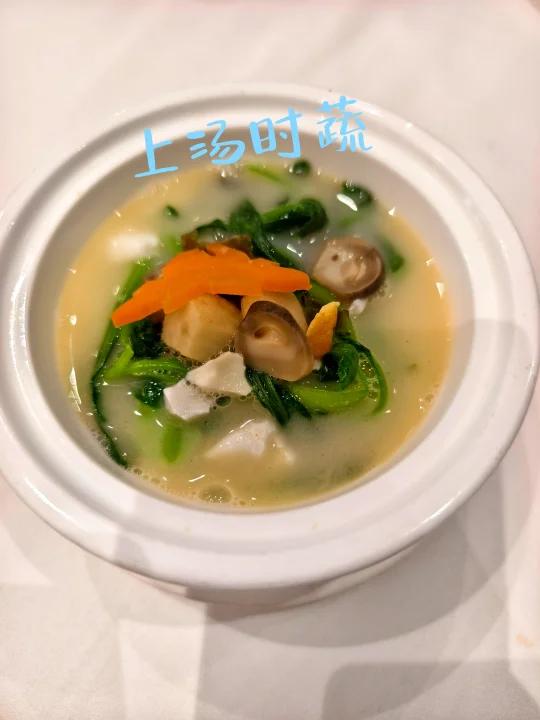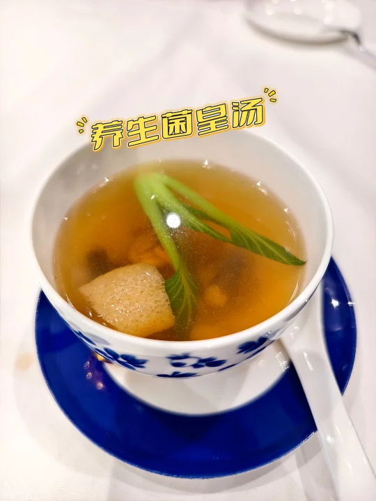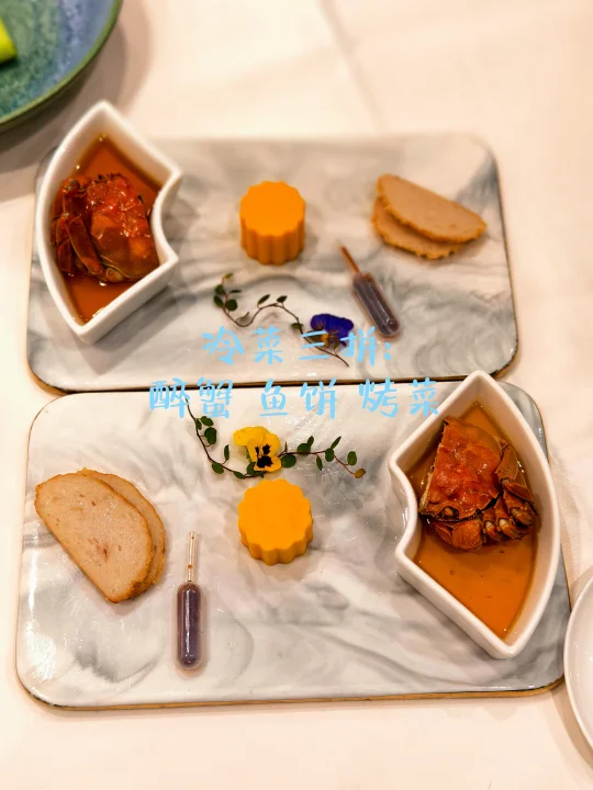 🔥冷菜三拼是醉蟹/鱼饼/烤菜,醉蟹还是很入味的,汤是养生菌皇汤。