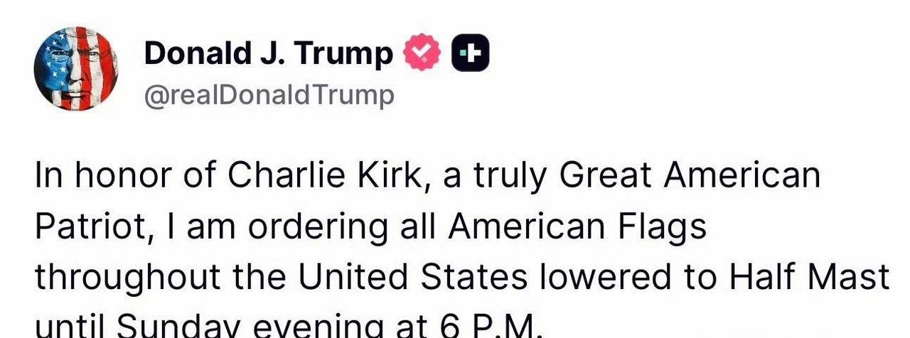 Trump要求全美国、所有国旗,都必须降半旗四天,以哀悼一位“真正的、伟大爱国者” 他在回答观众提出的关于跨性别美国人有多少拥有枪支的问题时,枪声突然响起,查理柯克应声倒下,送医后不治身亡。