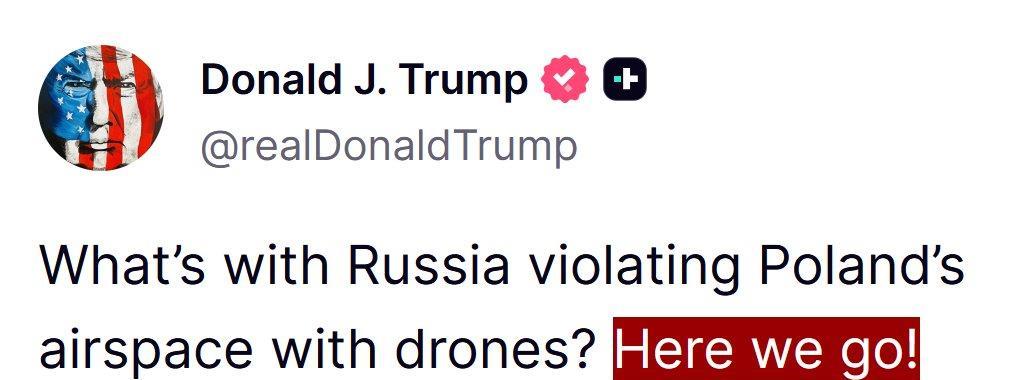 【俄无人机闯入波兰领空,F-35紧急升空!特朗普一句“好戏开始”全场懵了】 9月10日,19架俄军无人机突然闯入波兰领空,波兰总理图斯克紧急发声,称这是“自二战以来最接近公开冲突的时刻”,甚至要求启动北约第四条集体磋商机制。北约多国迅速响应,荷兰派出F-35隐身战机,在美意预警机和加油机支援下击落部分目标。 波兰反应激烈,但俄方到底是不是故意挑衅?三种猜测浮出水面: 一是俄方蓄意测试北约防空反应,无人机上甚至发现波兰本地电话卡,用于精确定位; 二是技术故障,白俄罗斯称也击落多架“偏离航线”的无人机,并提前向波兰通报; 三是乌克兰“借刀杀人”,试图拉北约正式下场。 关键时刻,特朗普在社交媒体上幽幽一句:“Here we go…”(好戏开始咯),没承诺、没立场,却让波兰官员彻底摸不着头脑。 尽管欧洲多国齐声批评俄罗斯,北约却雷声大雨点小。会照开,架照吵,但无任何实际反击行动。 说白了,北约仍是“纸老虎保险公司”:推销时天花乱坠,理赔时东躲西藏。 这出戏,终究是演给人看的。