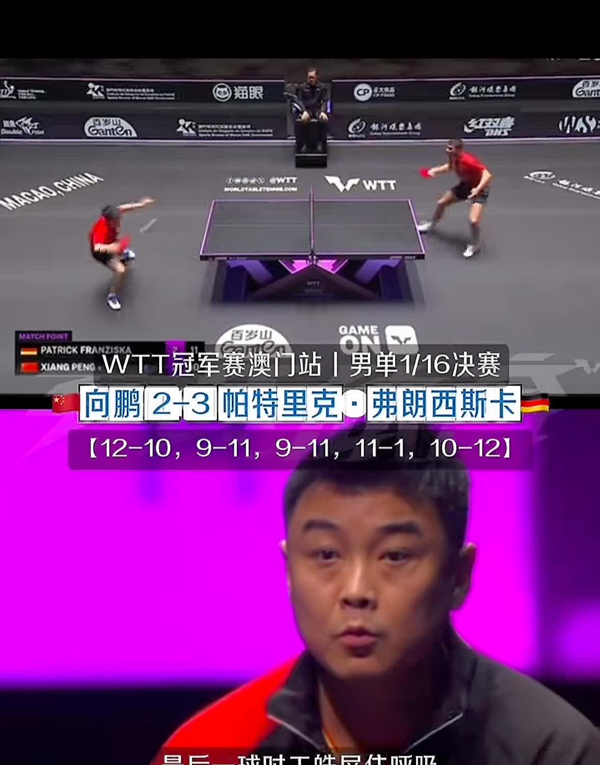向鹏输球又输人、擦边球惹争议! 值得讨论的是在一局的一个争议球,就可以很明显的看到弗朗西斯卡回球擦边,但向鹏这边也是说没有看到,还有一个擦网球也是有争议反正我是没看见擦网呀,解说也是说弗朗西斯卡在欧洲是出了名的好脾气……这场比赛弗朗西斯卡也是赢得了比赛也赢得了观众认可……虽然向鹏打的很猛,第四局甚至打出了11:1的悬殊比分,但在决胜局还是10:12惜败弗朗西斯卡,大比分2:3止步男单首轮、