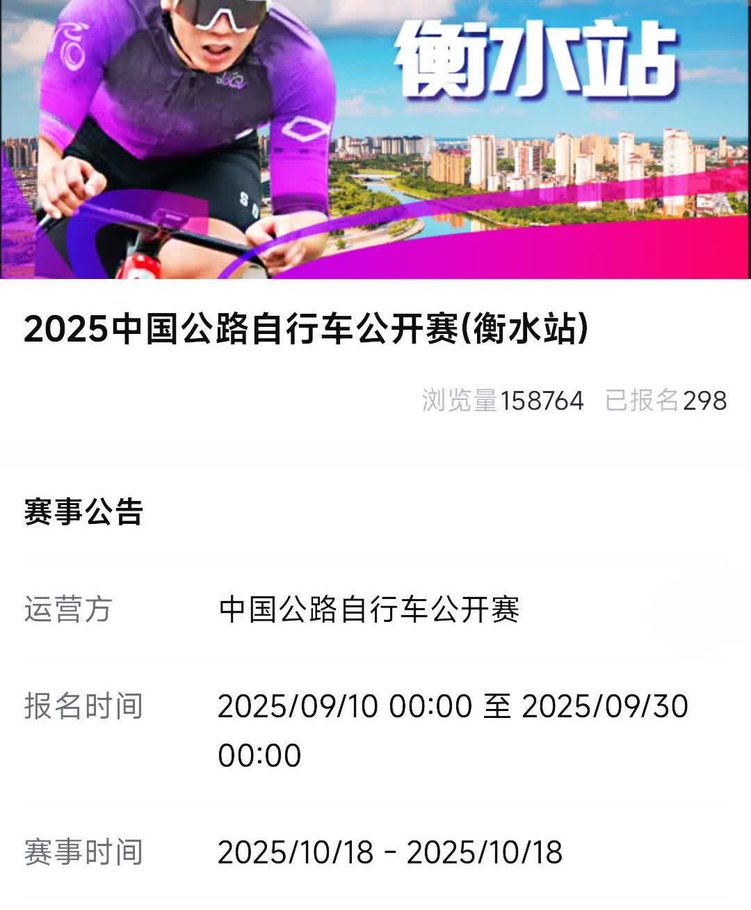 衡水刚刚将要举行衡水湖马拉松比赛,又一个好消息来了。 2025中国公路自行车公