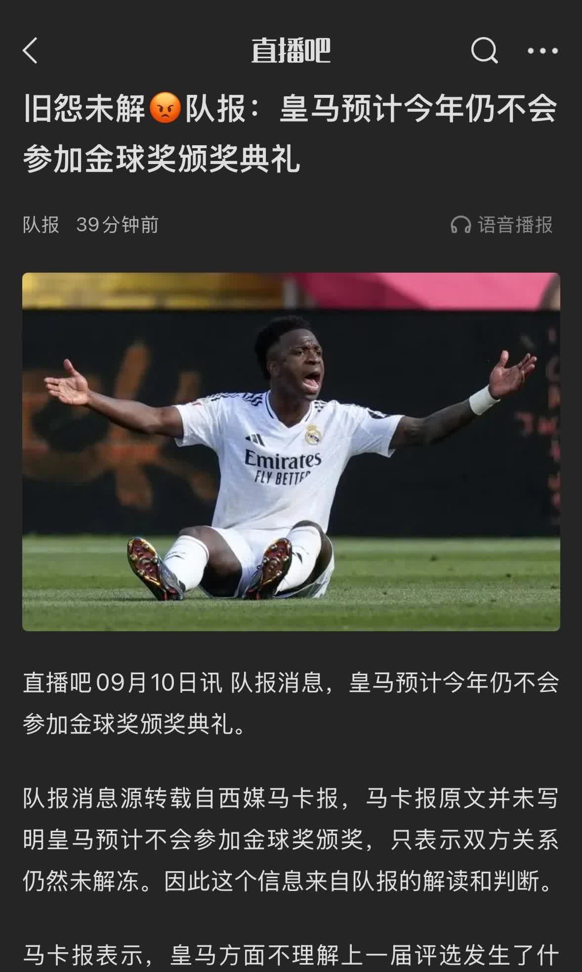 皇马今年还不参加金球奖颁奖典礼? 这可是西班牙马卡报的文章,皇马脾气够大。 其实皇马是金球奖的受益者,这么多年金球奖一半皇马,另一半是巴萨和其他豪门。 去年曼城罗德里才拿一次金球奖而已,十几年来英超才一次,西班牙队员才一次。 皇马只因不是自家威尼修斯拿,痛恨到今天? 今年肯定是大巴黎登贝莱,法国人,前巴萨球星,跟皇马没关系,不参加啦? 说实话皇马太小气了,该批评![抓狂]