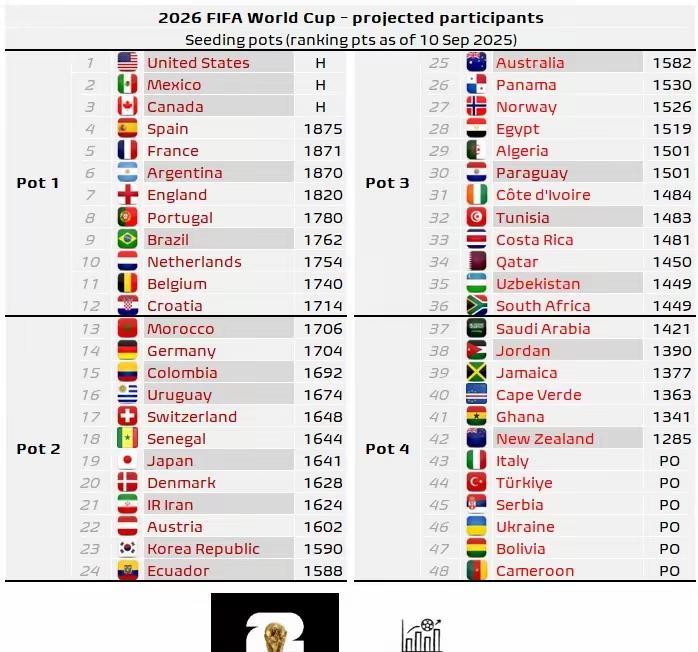 2026世界杯48支球队预测分档,大家可以提前预测下分组了!首先介绍下分档规则,美加墨三个东道主和获得世界杯参赛资格的世界排名前九名球队为第一档球队。剩下的直接晋级球队按照世界排名依次排进二、三、四档。欧洲区附加赛和洲际附加赛的球队也被分在第四档。欧洲球队一组不能超过两支,其他洲球队一组只能有一支。 有可能的死亡之组: 阿根廷、德国、澳大利亚、意大利 巴西、摩洛哥、挪威、土耳其 西班牙、乌拉圭、埃及、德国(有可能踢附加赛掉进第四档) 有可能的鱼腩之组: 加拿大、伊朗、南非、玻利维亚 美国、韩国、佛得角、新西兰 克罗地亚、塞内加尔、巴拿马、约旦