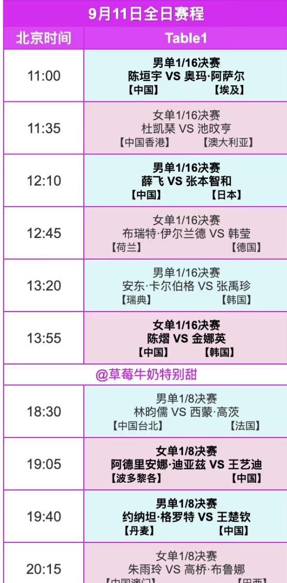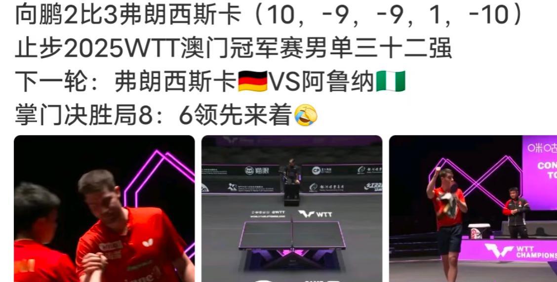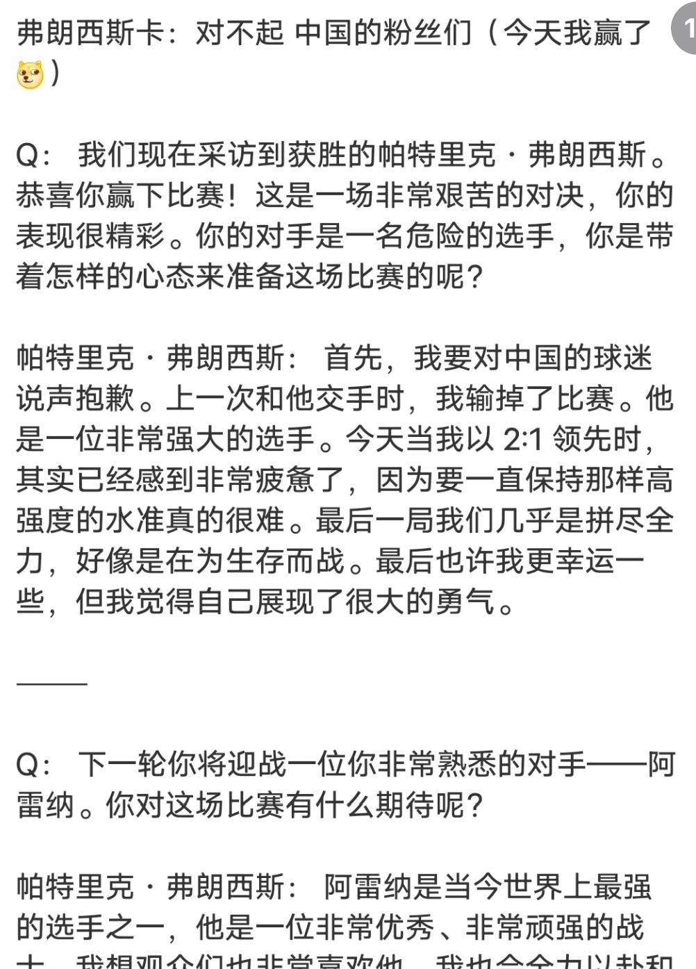 弗朗西斯卡更新:你好 澳门! 9月11日上午,弗朗西斯卡更新, 9月12日,中午12:35 弗朗西斯卡第二轮对战阿鲁纳, 弗朗西斯卡3:2向鹏赢的并不容易, 耗费了所有精力, 他在赛后采访中表示: 对不起了,中国球迷,我赢了! 上一次比赛我输给了向鹏, 他是一位十分强大的球员, 在我2:1领先的时候, 我已经非常疲惫, 我已经展示出我最大的实力, 还好,最后阶段我幸运了一些, 我想最重要的是我应该好好 睡一觉……” 看来弗朗西斯卡休息好了, 明天打阿鲁纳可能会比打向鹏 更容易一些, 阿鲁纳此前3:0黄友政晋级, 国乒加油, 国乒男队加油!