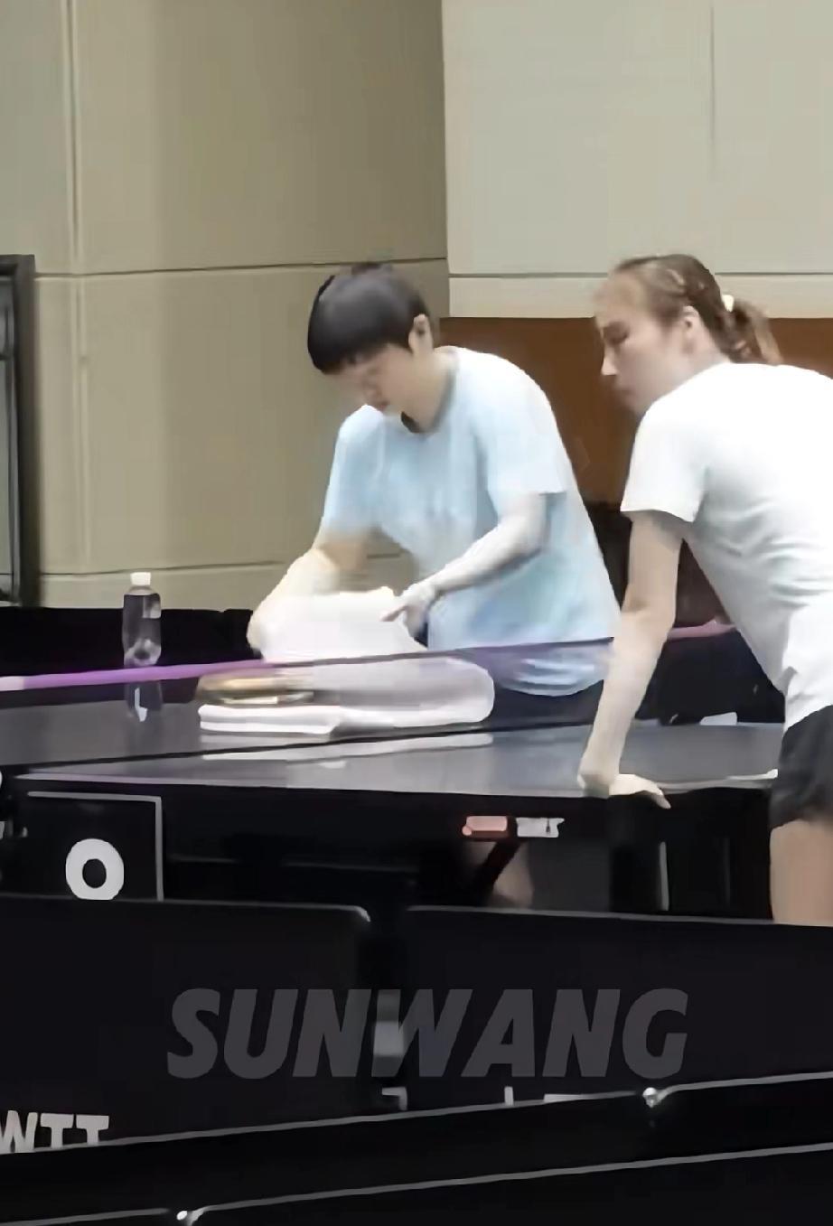 给你们看我会叠大毛巾,而且叠的漂漂亮亮的 莎莎上场前叠大毛巾,她把毛巾铺在球桌上