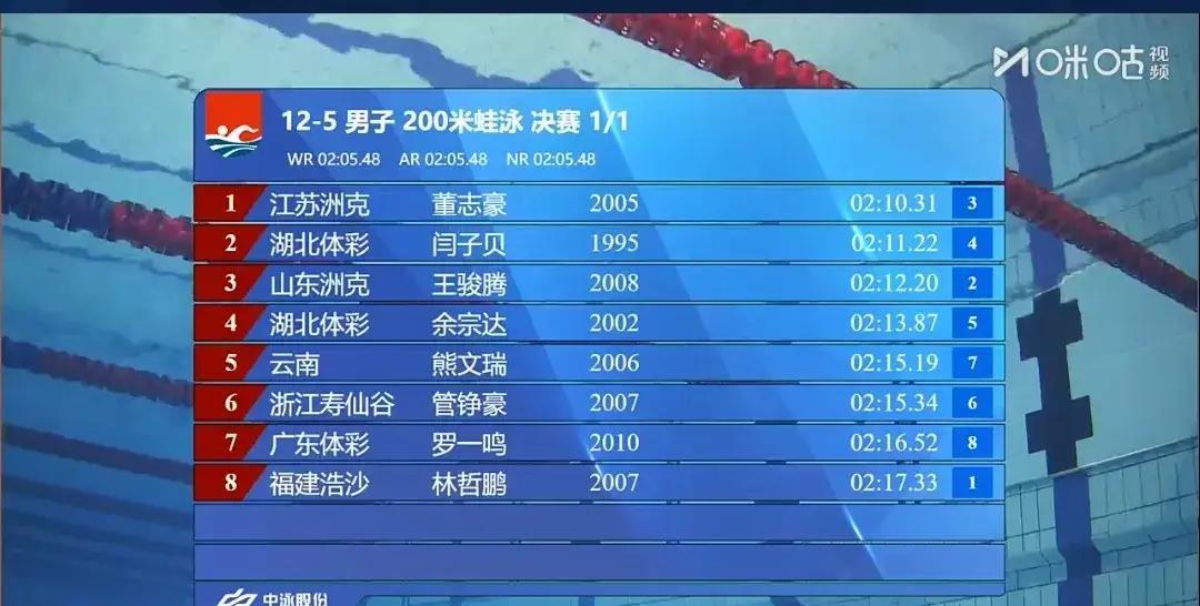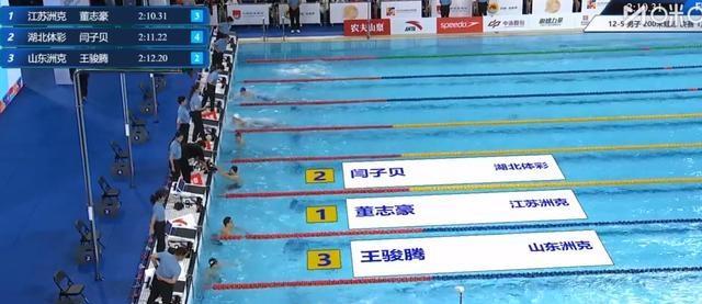 全国游泳锦标赛男子200米蛙泳决赛,前中国蛙王、湖北老将闫子贝与比自己年轻10岁的小将董志豪展开激烈比拼,擅长后程发力的董志豪在最后50米加速冲刺,并在最后25米实现反超,以2分10秒31逆转夺冠,闫子贝以2分11秒22拿到银牌,覃海洋未参赛。