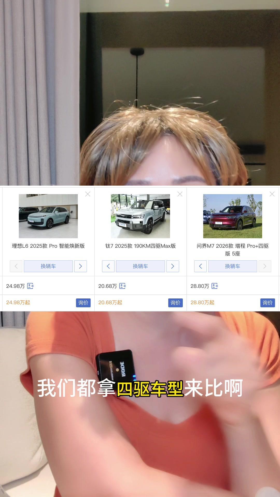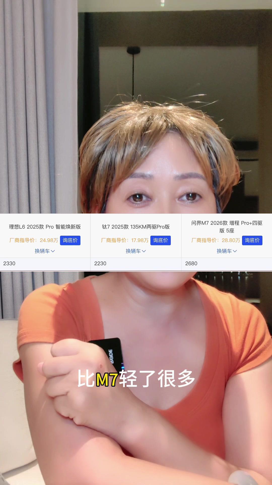先从底盘说起吧,L6的后悬架虽然用了高强度钢材,摆臂也是单板冲压,还能调节软硬,但没有育苗,而且看着像铝合金的部分其实是铁的,这点不如钛7实在。M7有CDC可调,但同样没有育苗,前悬架还是麦弗逊,虽然听说新款会换成前双叉臂,不过现在的配置确实一般。再看钛7,前双下臂、后五连杆,铝合金用料最多,轻量化做得很好,还带云眼吸育苗,部分底盘件甚至用了一体压铸,整备质量两驱2.2吨,四驱2.48吨,比M7轻不少,离地间隙也是三款车里最高的,通过性更好。 动力方面,钛7用的是第五代DM,优化后油耗更低。理想L6和问界M7都是增程,在油耗上确实比不过泰7的插混,经济省油这方面泰7更有优势。 价格也是钛7的一大亮点,拿四驱车型对比,它比L6便宜3-4万,比M7更直接低了8万,性价比很高。而且它的定位很有意思,是方盒子造型,既酷又兼顾家庭用车,还保留了越野性能,算是全能选手。不过理想L6的内饰豪华感和家用舒适性暂时领先,M7的华为ADS自驾也还是顶流。 说起来它会不会影响自家兄弟呢?我觉得可能性不大,毕竟定位和优势都不同,更像是精准打击竞品的短板。