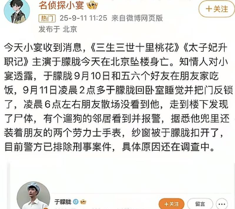 爆料细节:9月10日晚于朦胧与友人聚餐,次日凌晨反锁房门后坠楼,纱窗被扣开,随身