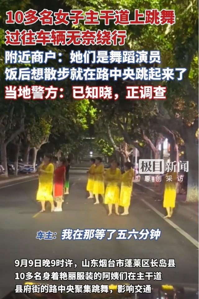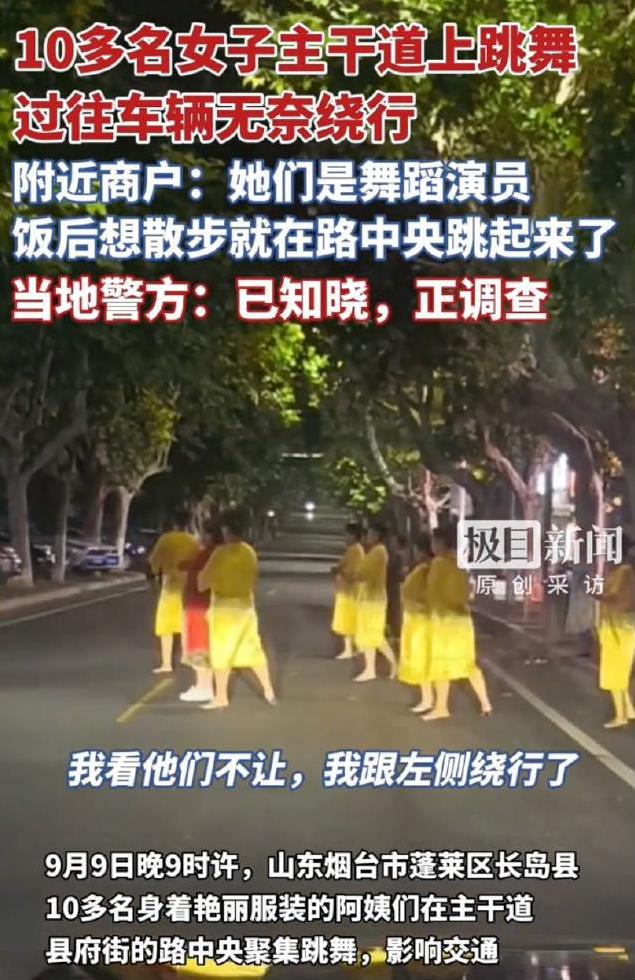 马路上跳起了广场舞,10多名大妈逼得过往车辆只能绕行。 据极目新闻报道:9月9日晚上9点多,山东省烟台市蓬莱区长岛县,10多名身着艳丽服装的阿姨们,在主干道县府街的中央聚集跳舞,影响了当地的交通。 这年头,小区广场是给大妈们跳舞的,商场广场是给大妈们跳舞的,现在连马路,也是给大妈们跳舞了。 这10多名穿着艳丽服装的阿姨们,一看就是平常经常练习舞蹈,勤于锻炼的。前面还有领舞的人员。她们在马路中央排起了队形,放起了音乐,全然不顾身旁和马路上的来往车辆。 据事后采访了被挡住道路的其中一位车主:“我在那等了5-6分钟,我看她们不让,我就左侧绕行了。” 10多名阿姨们在马路上跳舞期间,过往的车辆只能被迫减速并绕行,让原本通畅的道路出现了明显的拥堵。 有些被堵住的车主表示,阿姨们一种“马路是我开”的气势,公共道路是让车开的用途此刻被完全颠覆。 另外,据附近一家商户介绍,9日晚间,这群阿姨曾在店内用餐。该饭店的老板说:“她们是舞蹈演员,计划是在10号晚上当地有演出的。” 阿姨们在店内用餐完后,想要散散步,于是就在前面马路中央放起了音乐,跳起了舞。 这一说法似乎是让这次行为披上了“饭后娱乐消遣”的外衣。 难道阿姨们饭后的兴致所知,就可以在马路上跳舞占道么? 很多网友表示:又是让人厌恶的无功德的大妈,是时候该打击了! 有些网友还说:每天楼下的广场上那些音乐就吵死了,竟然还跳到马路上去了? 《交通安全法》第三十一条明确规定:未经许可,任何单位和个人不得占用道路从事非交通活动。 本案中,跳舞者们未经行政许可,擅自占用机动车车道进行娱乐活动,直接违反了上述条款。 他们的行为,其实剥夺了机动车的合法路权,迫使车辆在非规定的轨迹上行驶(绕行),这不仅降低了道路通行效率,更是极大地增加了发生剐蹭、碰撞等交通事故的风险,对自身和他人的人身安全都构成了潜在的威胁。 另外,参考《治安管理法》第二十三条:扰乱车站、港口、码头、机场、商场、公园、展览馆等其他公共场所秩序的。可能会受到处警告或者200元以下罚款的处罚。 如果此次事件中,经过判定,阿姨们的跳舞时间长,且造成了交通拥堵等严重到了一定程度。也会构成扰乱公共秩序的判定。 这起“马路广场舞”事件,当地也正在进行调查,最终很有可能对组织和参与者进行做出警告的处理决定。 不管老年人还是舞蹈演员,个人享有的健身娱乐的自由,应该有一个适当的边界,不应该建于损害他人的权利和公共利益上。