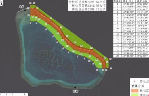 黄岩岛国家级自然保护区已经出现在地图上。这个保护区并没有包括所有的环礁,而是北部的这一块的环礁。