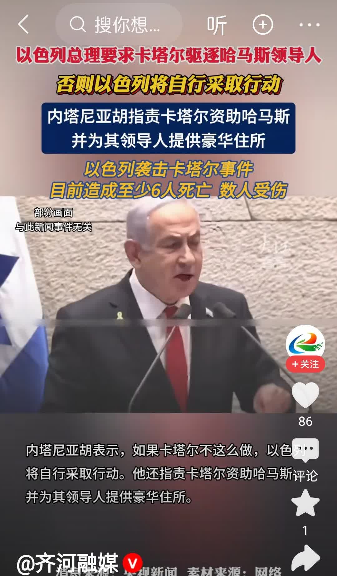 以色列提前警告过卡塔尔,不要收留哈马斯领导人。以色列只针对哈马斯领导人,卡塔尔任