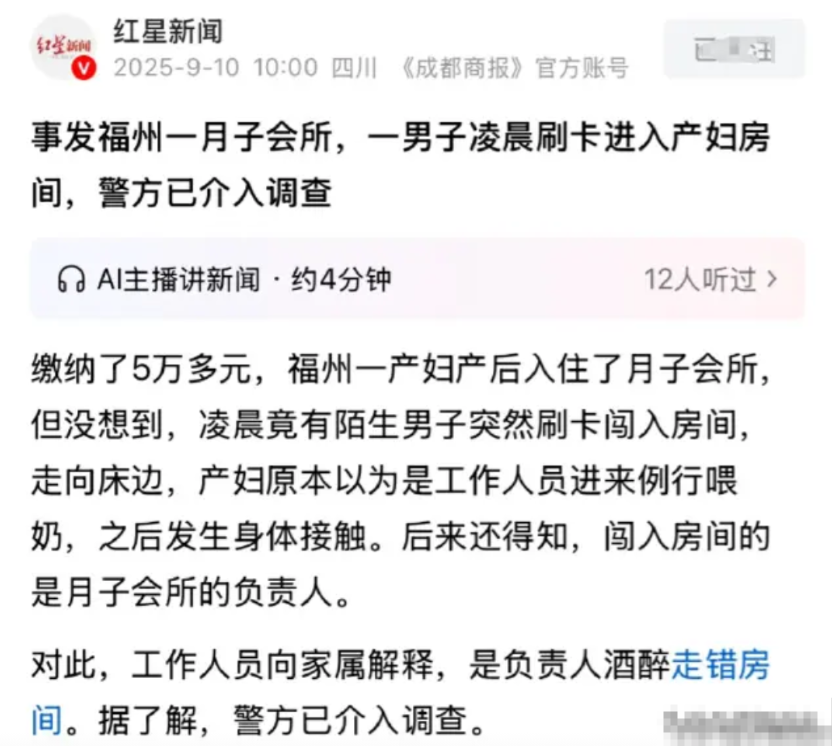 红星新闻九月十号报道了女子在高价月子中心休息时,差点被负责人猥亵的新闻,事情的经过是这样的。
