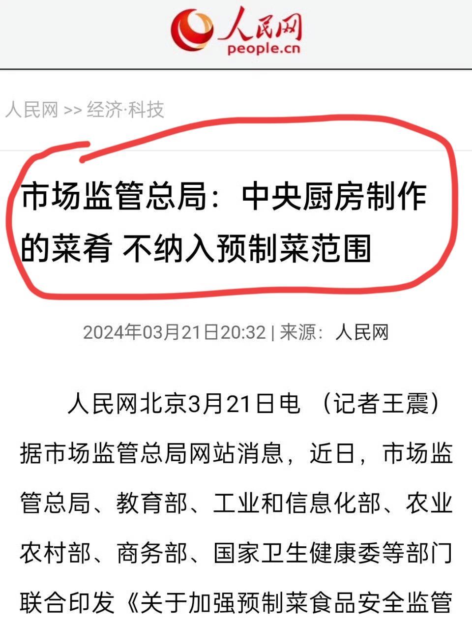难怪西贝不觉得自己是预制菜,敢在直播的时候拿出来材料。 这么看,它确实不是预制菜,中央厨房制作的不算预制菜。 现在大的连锁店,都是中央厨房统一制作,这样就不会有味道不统一的问题。 消费者在意不是预制菜的问题。 而是你要告诉我,这不是现场制作的。