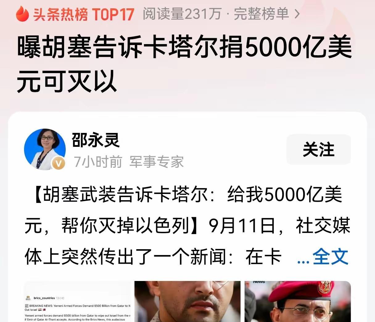在中东,散沙一样的抗以阵线,其实顶多聊胜于无。 但你得承认:胡塞武装这帮哥们儿,绝对是一骑绝尘,是中东各路打击以色列队伍中,唯一让世界刮目相看的铁汉子。 以色列9月9号晚一10号凌晨,15架战机1700公里奔袭,轰炸卡塔尔多哈后。 世界惊呼:以色列踏马滴72小时居然向6个中东国家开打! 但是,这帮扶不上墙的中东国家,集体沉默。先别说还手,还嘴的都凤毛麟角。 但胡塞武装不忍。9月12日胡塞向卡塔尔喊话:只要给我们5000亿美元支持,我们就坚决将以色列从地球上抹去! 卡塔尔肥的流油,沙特富的冒泡。但他们敢吗?他们敢当一回硬骨头吗? 所以说,不一定是穷了就要挨打,富可敌国照样可以被人揍的鼻青脸肿。