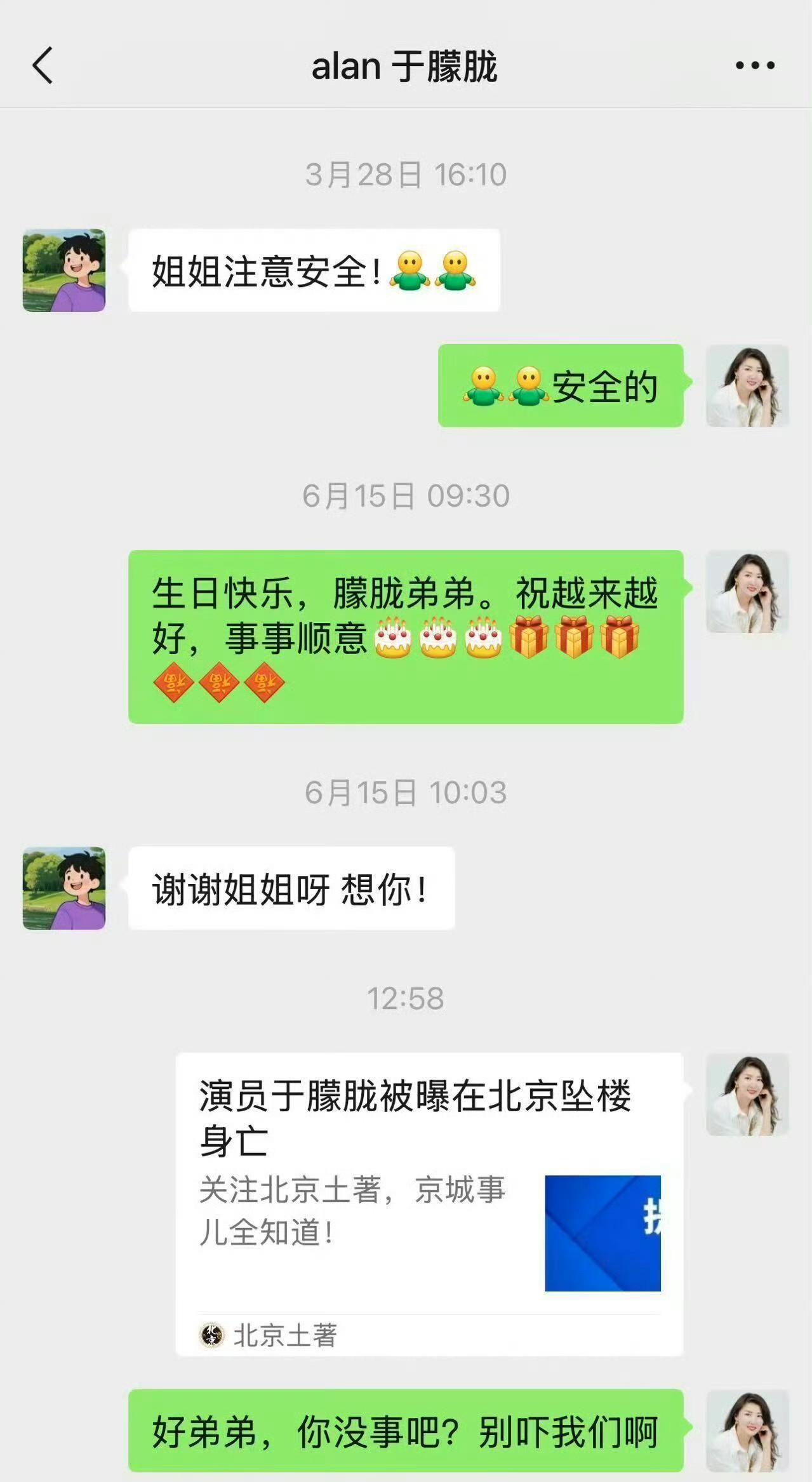 他真的是个特别真诚、谦逊的人,跟人说话永远那么温和有礼。朋友发的聊天记录里,他总会细心问候、关心别人,一点明星架子都没有。 好多人看了都说:这么温柔的一个人,怎么说没就没了…… 聊天记录里还能感受到他的温暖,现在却再也收不到他的消息了。