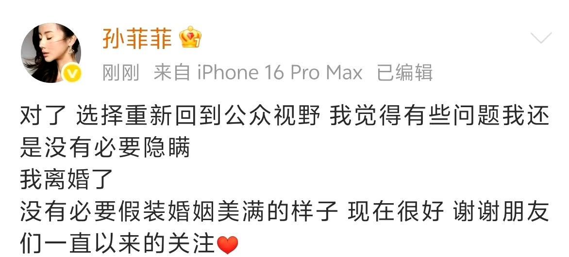 #孙菲菲官宣离婚# 孙菲菲一句“我离婚了 现在很好”,干脆利落官宣离婚消息,文末的[心]也透着卸下束缚后的松弛感,还不忘感谢朋友长期的关注,态度坦诚又从容。 摆脱婚姻桎梏,重新做回自在的自己,这份洒脱格外圈粉。不少网友也在期待,接下来她能回归热爱的拍戏领域,带来更多新作品!