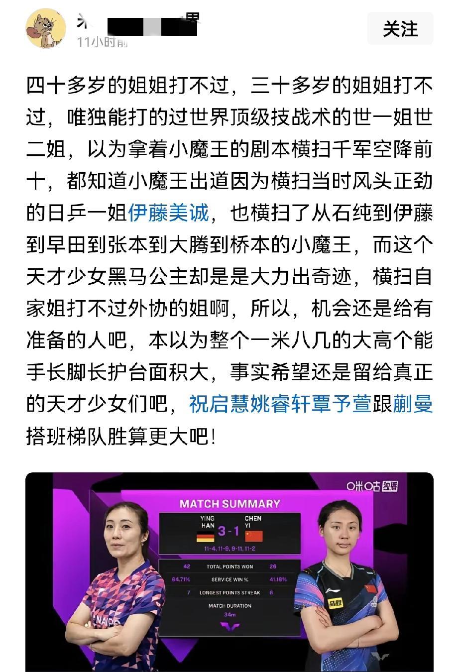 知道陈熠输给了韩莹会被喷,但能不能像许昕说的那样别太狠稍微轻点? 这位是说话真是狠,说人家四十多岁三十多岁的姐姐都打不过,独能赢自己队里的世一世二,反正说的人家一无是处,连长的高都是被喷的点儿。