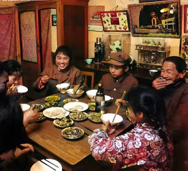 这是1980年广州一家人吃晚饭的场景。当时,这也是属于一大家子,全家七口人。大人与孩子将一张圆桌围了一圈。可是,桌上的菜并不多。七个人要吃三个菜,平均两人划不上一个菜。当然,这三个菜的菜量也并不大。这样,父母不舍得吃菜而留给孩子吃。小孩子可能不懂父母的用心,大点的孩子已经懂得父母,也很少向菜盘里伸筷子。 八十年代初期,一家七口人吃三个菜,配上充足的饭,已经属于不错的生活水平。农村中的农村家庭一家七口可能桌上会放一盆简单的饭菜。这盆饭菜既当菜吃,又当饭填饱肚子。农村里更贫困的家庭在八十年代初期甚至还难以填饱肚子。