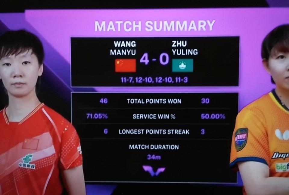 就差孙颖莎了,国乒女队即将包揽四强! #万能生活指南# 王曼昱与朱雨玲一战,两人都是两面反胶,短兵相接,直接展开激战。 王曼昱在大比分3:0,第四局6:3时,叫了暂停,暂停回来,士气如虹,连续得分,10:3,朱雨玲侧身进攻出界,王曼昱11:3,拿下胜利。 王曼昱晋级女单四强,下轮对阵陈幸同,今天陈幸同是4:1淘汰了削球手韩莹。 国乒女队即将包揽四强,就等孙颖莎与迪亚兹这一场,也相信孙颖莎会拿下的。 半决赛对阵: 1、孙颖莎Vs蒯曼 2、陈幸同Vs王曼昱 不出所料,大概率又是孙颖莎与王曼昱争冠。 因为:蒯曼冲击不了孙颖莎,陈幸同也不会与王曼昱硬拼,但这两场打起来,肯定还是好看的。 恭喜王曼昱晋级女单四强!
