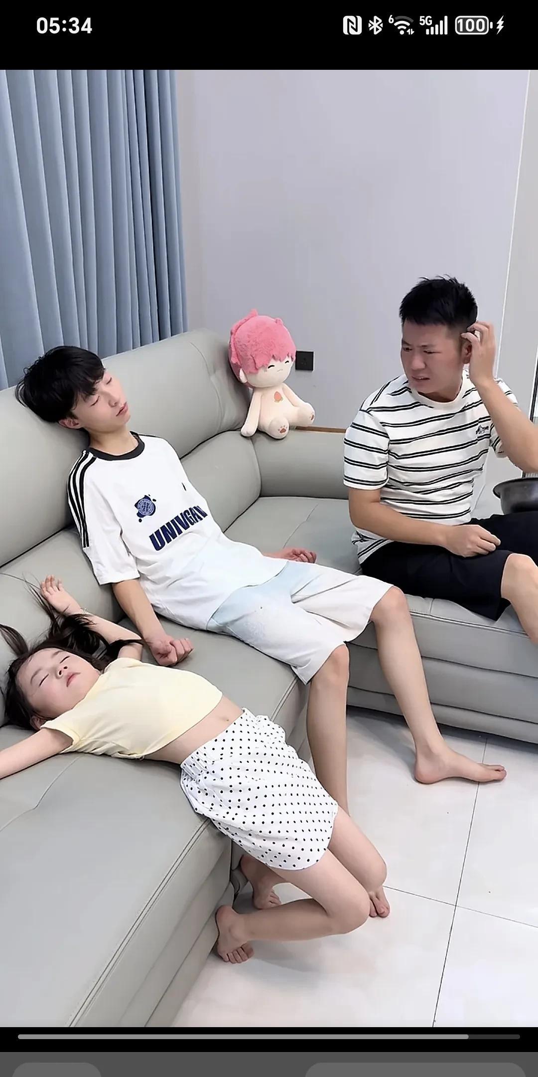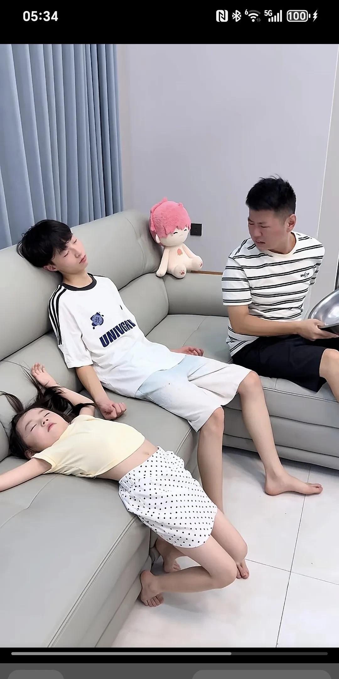 闺女的反应还挺快... 这锅我不背。 爸爸正在沙发上睡觉,儿子进门用盆在爸爸头上