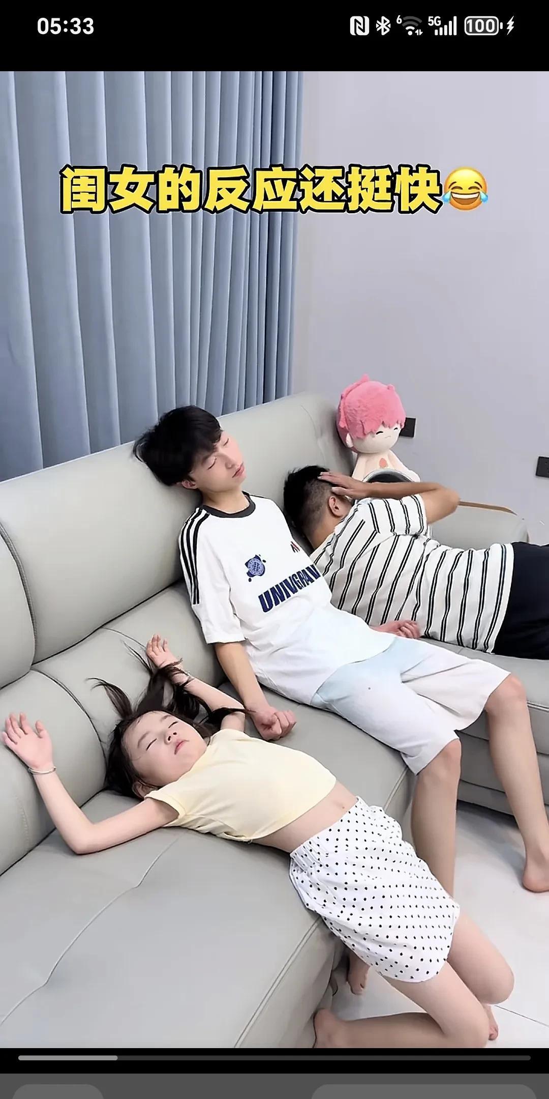 闺女的反应还挺快... 这锅我不背。 爸爸正在沙发上睡觉,儿子进门用盆在爸爸头上打了一下快速坐沙发上装睡,没想到在一旁看电视的妹妹装睡的动作更快,爸爸醒来挠了挠头一头雾水,感觉莫名其妙,但看儿子,女儿都睡着了。 这姑娘的动作非常迅速,像是触电一样动作敏捷又特别到位。真的是毫无知觉一样,特逗。 估计这姑娘是黑锅背怕了,才练就的这么迅速的反应。
