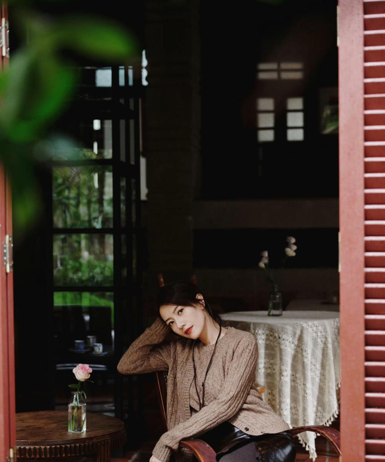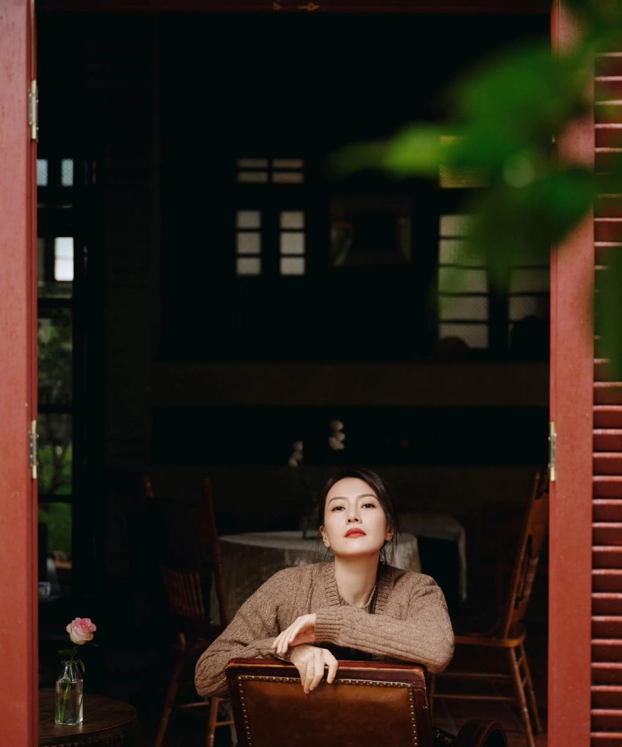 高圆圆一身暖棕针织搭配亮面黑裙,在雅致空间里,或倚墙浅笑,或静坐沉思,慵懒又优雅