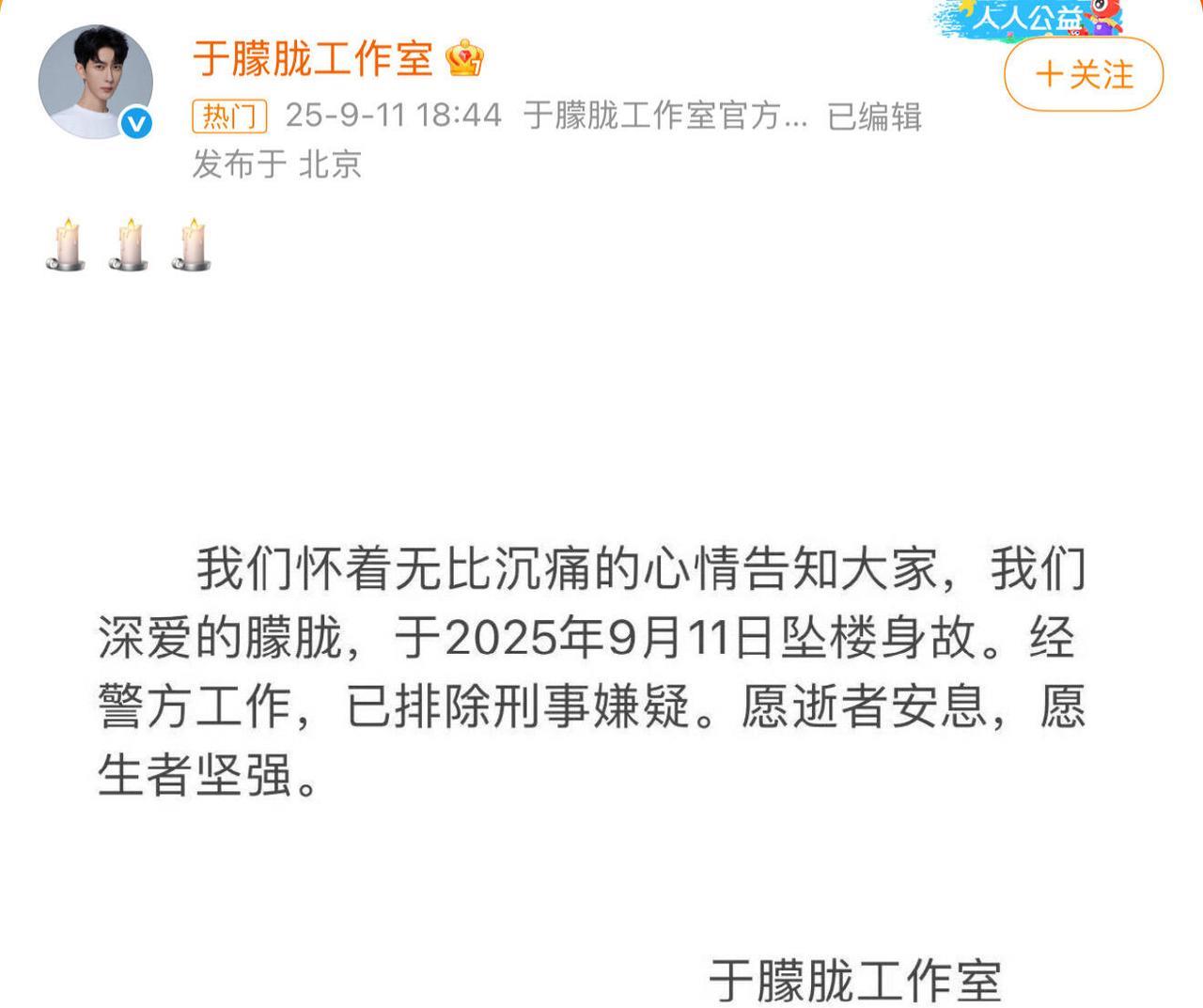 泪目!于朦胧工作室发布讣告,沉痛宣告他在2025年9月11日坠楼身故,警方已排除