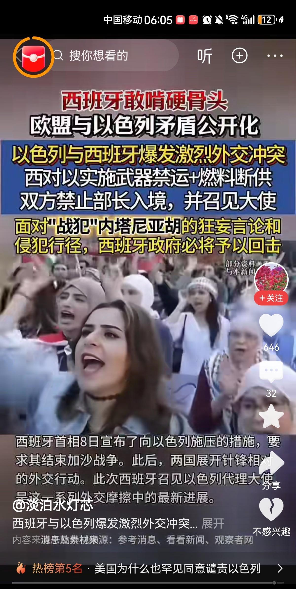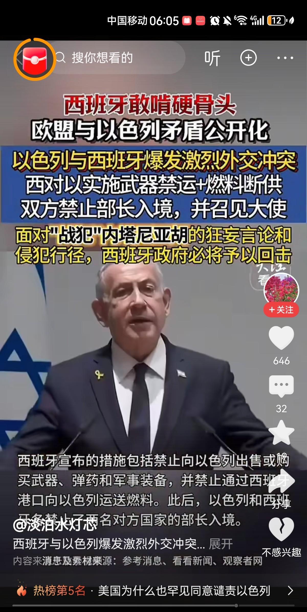 西班牙强硬叫板以色列:严词批判,实施武器禁运 此次西班牙表现得极为强硬,直接与以色列叫板。9月8日,西班牙首相桑切斯宣布了9项举措,旨在阻止“加沙种族灭绝”。其中包括对以色列实施武器禁运,禁止为以色列军方运送燃料的船只使用西班牙港口,还将以法律形式确定军事装备销售禁令,减少空运军事装备输送。 桑切斯严厉批判以色列,指出其虽有生存和自卫的权利,但绝无“消灭手无寸铁民众”的特权。那些参与加沙地带种族灭绝等罪行的人员,将被禁止进入西班牙。 西班牙的这一系列操作,无疑是在国际舞台上为正义发声。原本以为西方阵营铁板一块,没想到西班牙挺身而出。 ∽end~ #晒图笔记大赛#