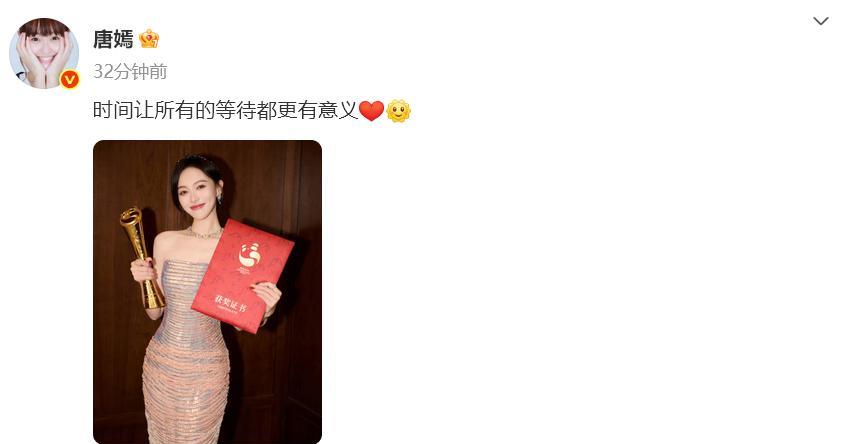唐嫣在获得金熊猫视后的首次晒照,配文道:“时间让所有的等待都更有意义。”再次祝贺