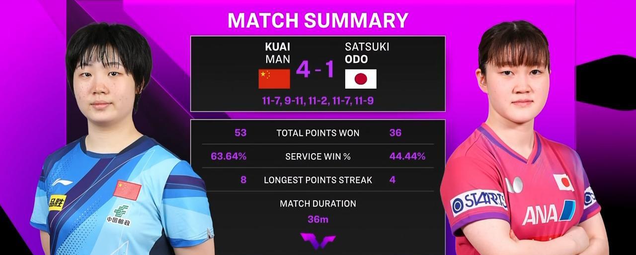 蒯曼顺利击败大藤沙月晋级WTT冠军赛澳门站丨女单四强! WTT冠军赛澳门站丨女单1/4决赛 本场比赛第一局蒯曼通过正手连续强攻建立优势,5平后连得5分锁定胜局;第三局更打出8-0碾压开局,最终以11-2速胜。 蒯曼攻防转换优势明显,蒯曼正手爆冲(转速达125转/秒)和落点控制(尤其中路压制)限制大藤沙月反手发力空间,致使大藤沙月频繁预判失误。 关键分掌控蒯曼做的也非常不错,第五局9-6领先时被追至9-8,蒯曼果断暂停调整,最终以反手变线锁定胜局。 此战获胜后,蒯曼对大藤沙月实现 国际赛事6战全胜,明天蒯曼将与孙颖莎与迪亚兹的胜者争夺决赛席位!