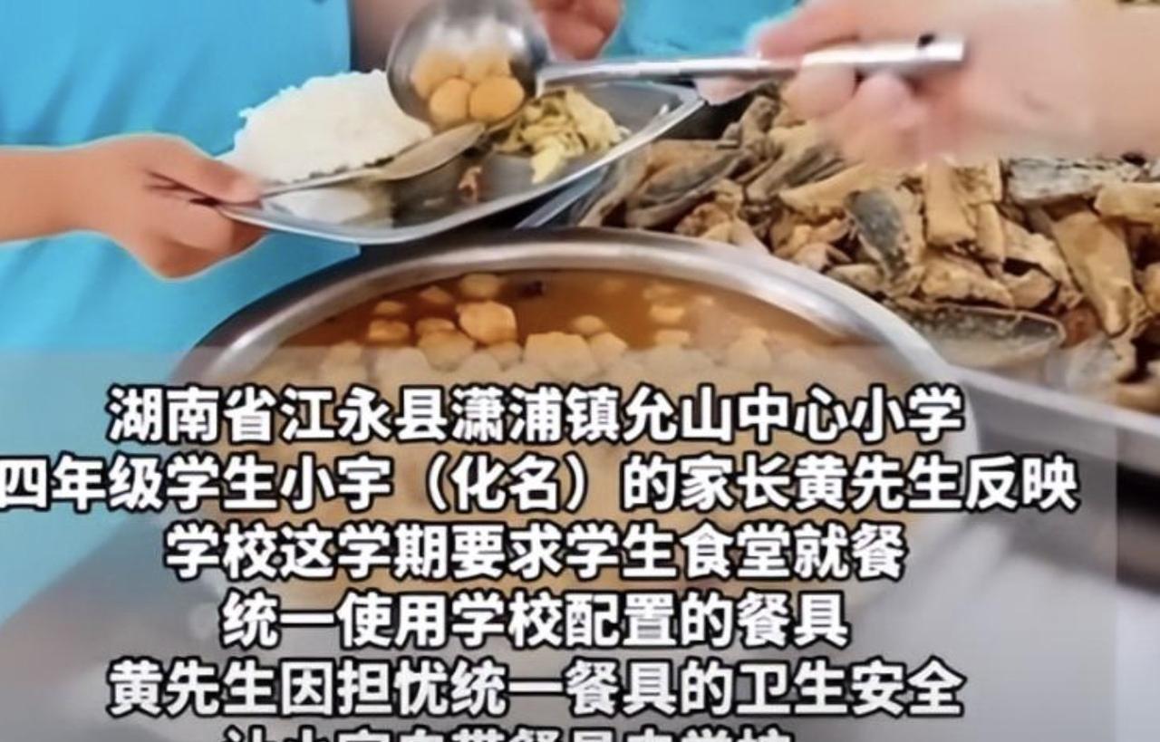 校长说学校食堂统一更换餐具,学生可自愿选择是否使用,学生自带餐具去打饭却遭拒,背后到底是食堂人员执行不到位,还是说所谓的自愿只是一句空话? 湖南省黄先生的儿子是一所小学四年级的学生,在开学当天校长宣布学生在食堂就餐,统一使用学校配置的餐具,但这个是自愿选择是否使用。黄先生担心餐具安全问题,就让孩子自带餐具。可孩子去打饭的时候却遭到了拒绝。结果就是孩子连续三天,靠着同学分的饭菜充饥。而后续记者采访学校校长,校长却是答非所问,不敢正面回应。现在这起事件最新进展是,当地教育局已经关注到,并且进一步地调查中。 我是不太相信,食堂工作人员有那么大的权力,敢于无视校长的命令,背后的真相只有一个,他们也是不得已而为之的,所以所谓的自愿选择,咱们懂得都懂。而学校统一配备餐具,家长干嘛还要多此一举,让孩子自带餐具,这是不是有点矫情了?这还真的不是矫情的问题,而是出于现实的考虑,我有注意到,黄先生透露的一个信息是,孩子使用完餐具之后,需要自行清洗餐具,然后统一叠放。 一般来说这么大的孩子,你让他们来清洗餐具,其实是很难清洗干净的。当然了,即使清洗干净了,也是需要再次统一消毒处理的,可学校在这块却是不透明的。按理说餐具消毒而已,又不是什么机密,公开透明没什么难度吧。所以学校的不透明,是毫无道理的。家长怀疑学校餐具不卫生,让孩子自带餐具,也是合理请合理的。 而想要解决家长的疑虑,只需要把这个环节透明化就可以了。可学校却选择为难学生,你不用我们的餐具就不给你饭吃,说实在的这个行为,挺可恶的,而与此同时也越发让人怀疑,不公开餐具消 毒的背后,是不是真的有猫腻!