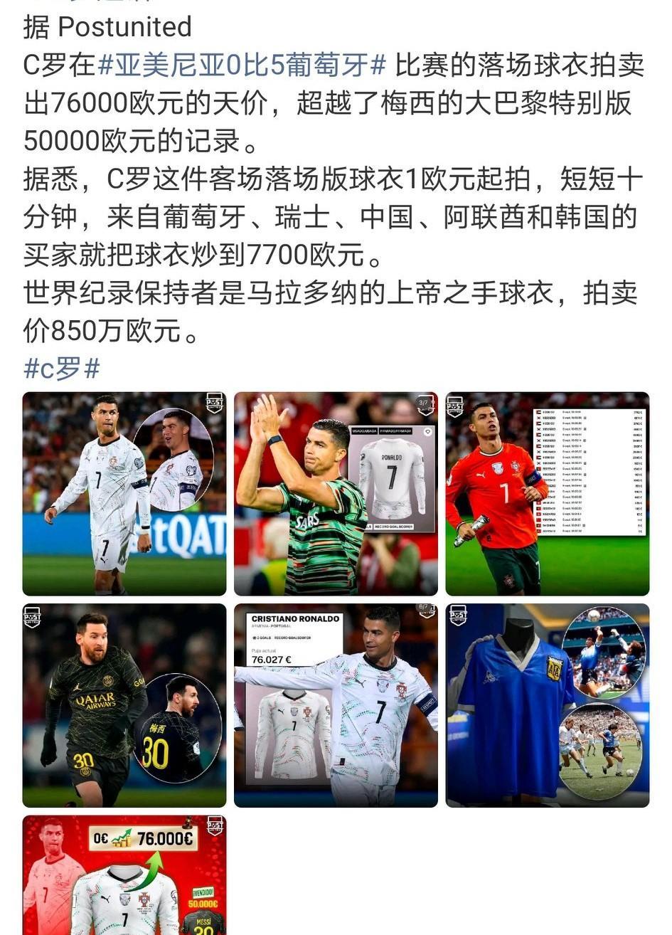 C罗在亚美尼亚0比5葡萄牙比赛的落场球衣拍卖价:76000欧元 梅西大巴黎特别版拍卖价:50000欧元。 马拉多纳的上帝之手球衣拍卖价:850万欧元。