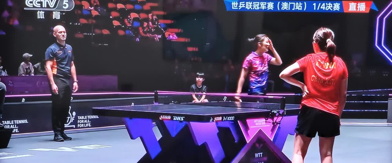 陈幸同和韩莹竟然把打进了非常少见的轮换发球法。因为韩莹是削球,陈幸同跟她用了非常