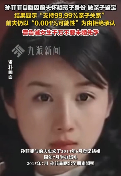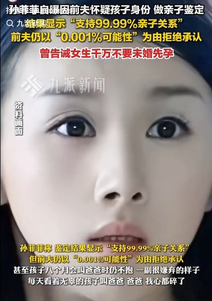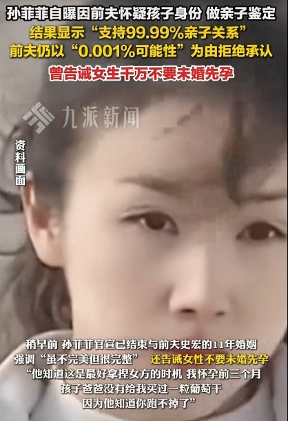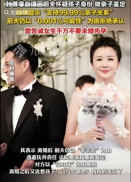 之后孙菲菲在社交媒体自曝自己不幸的婚姻细节,在婚姻存续期内,丈夫曾多次怀疑两人的孩子非亲生,孙菲菲为了拯救婚姻,主动提出做亲子鉴定,鉴定结果为99.9%有血缘关系,但是丈夫依然以还有0.01%的可能性拒绝承认孩子。