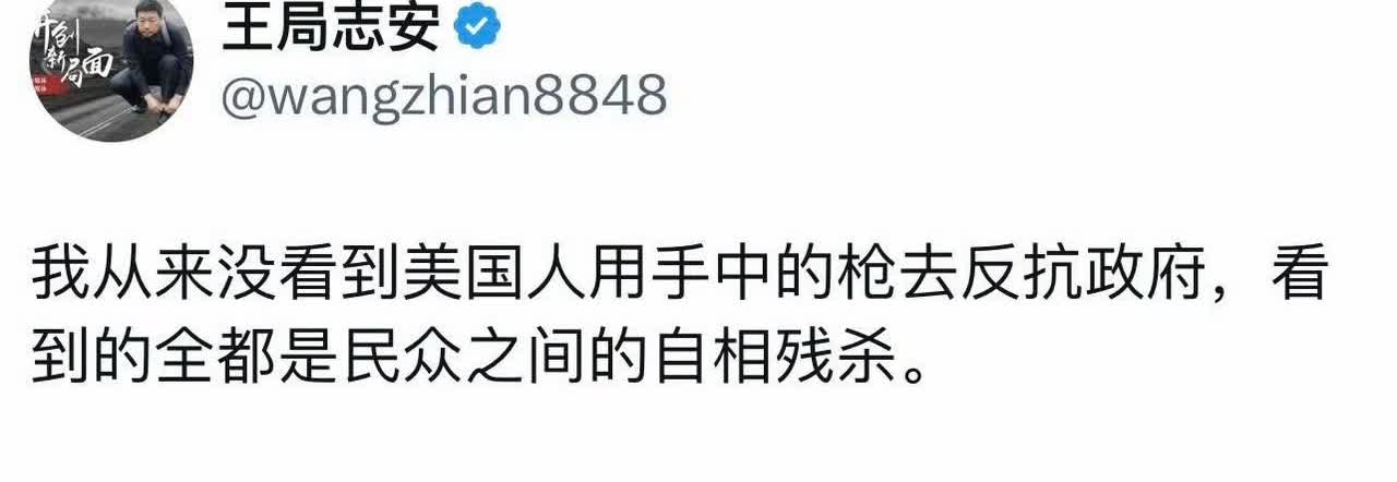 对呀,美国人为什么不按王志安的说法去干呢?你美国人手里有枪,不要残杀民众啊,应该反抗美国暴政啊! 连王志安都看不下了,可见美国权贵的愚民政策、分化群众政策、挑动群众斗群众的政策到了令人发指的地步了!