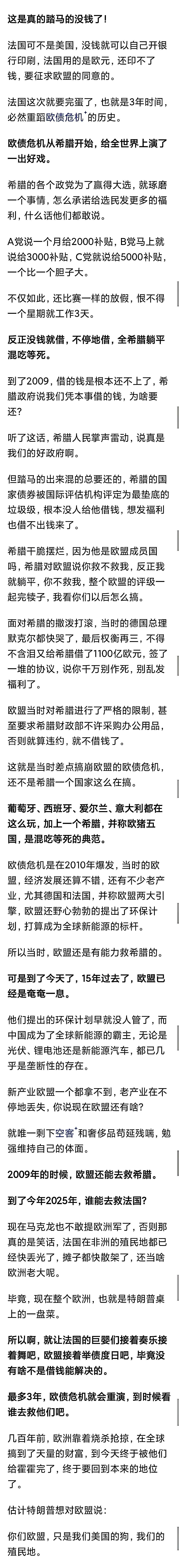 多年来的高福利养尊处优让他们已经忘了,财富是要靠扎扎实实的劳动生产才能产生的。 老祖宗当海盗打家劫舍弄来的巨额财富,不到200年就被不肖子孙嚯嚯一空,老欧洲快进到发展中国家系列了。 由奢入俭难,新兴高科技产业的失败,高福利难以为继,欧洲早晚会沦为战乱之地,像现在的中东。 不只是法国,整个欧美的所有国家都会这样。欧美的阶级矛盾已经逐渐极端化,虽经思想洗脑多年,但是难以掩盖不得不切身体会的阶级矛盾。基本上就到了不得不爆发的时候。 此外就是中国的社会主义实践的成功,以及中国现在的形势和现状让欧美国家的人意识到,他们享受的远不能算是有多幸福,很多方面还比不上这个作为发展中国家的中国。 这就让人们又回想起来了早年曾经期待过的共产主义和社会主义,曾经人们以为那只是幻想。但是中国的实践告诉人们,那不只是理想,那是可以变成现实的。而且那个现实还真的很美好。 所以……
